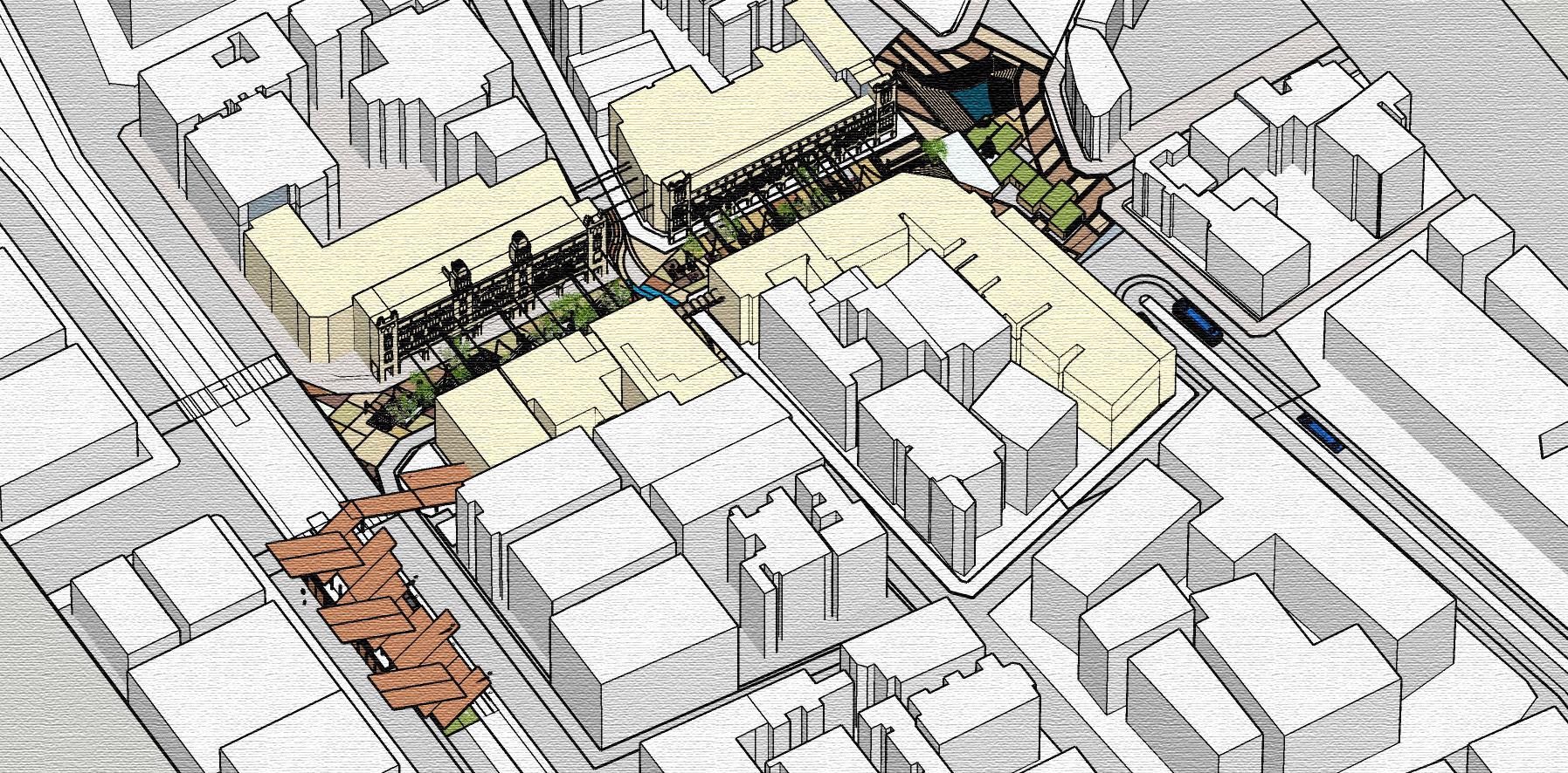 the main reason for this 2 big 3d section to show the relation between the surrounding context and the pedestrian road and the relation with the urban mass and architecture.
