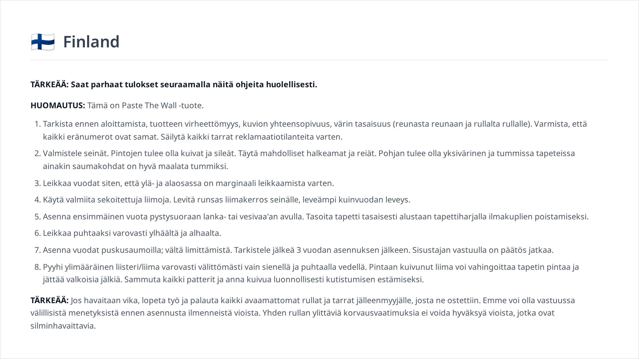VIKTIGT: Om ett fel upptacks, stoppa jobbet och returnera alla ooppnade rullar och etiketter till aterforsaljaren dar de koptes. Vi kan inte hallas ansvariga for foljdforlust for brister som uppenbaras fore upphangning. Inga ansprak som overstiger 1 rulle kan tillatas for defekter som ar synliga vid uoohananinastillfallet.