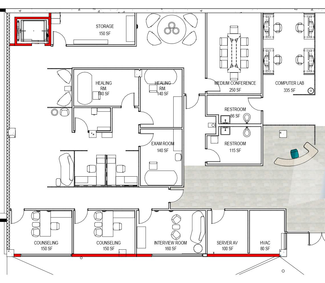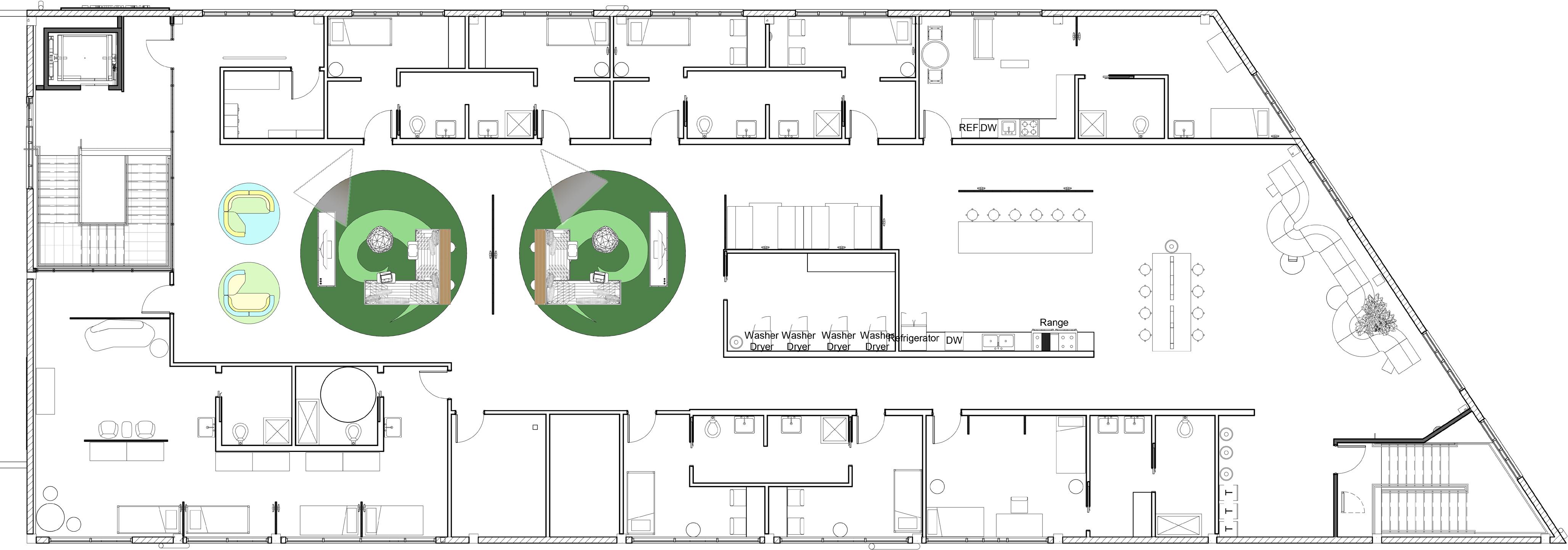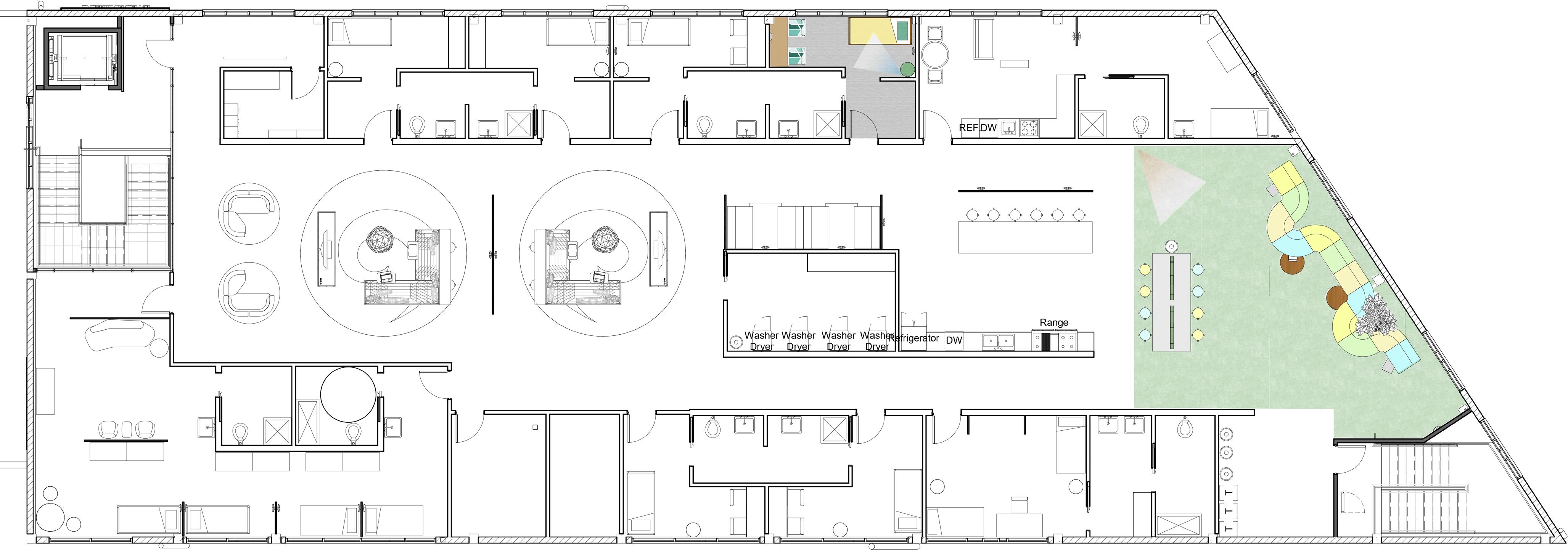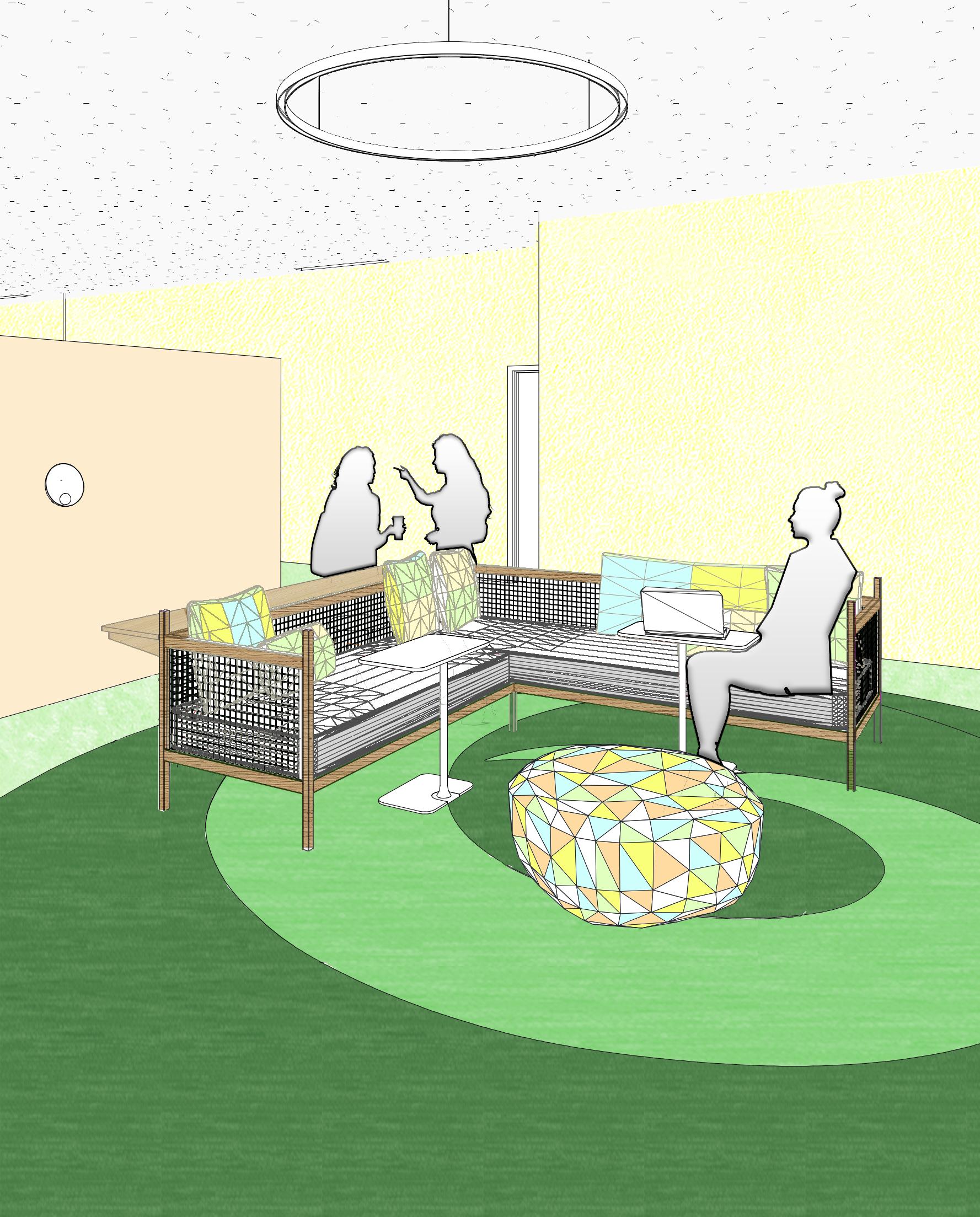 On this new journey, residents are adjusting to their transition back into society. The lounge space provides the residents options to choose their social mood. This area emphasizes the importance of choice, peer support, and collaboration.
