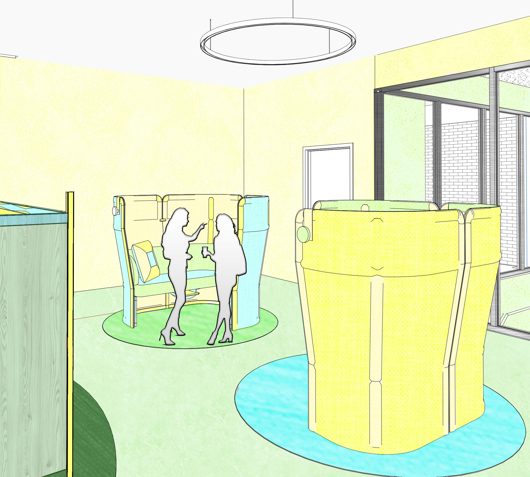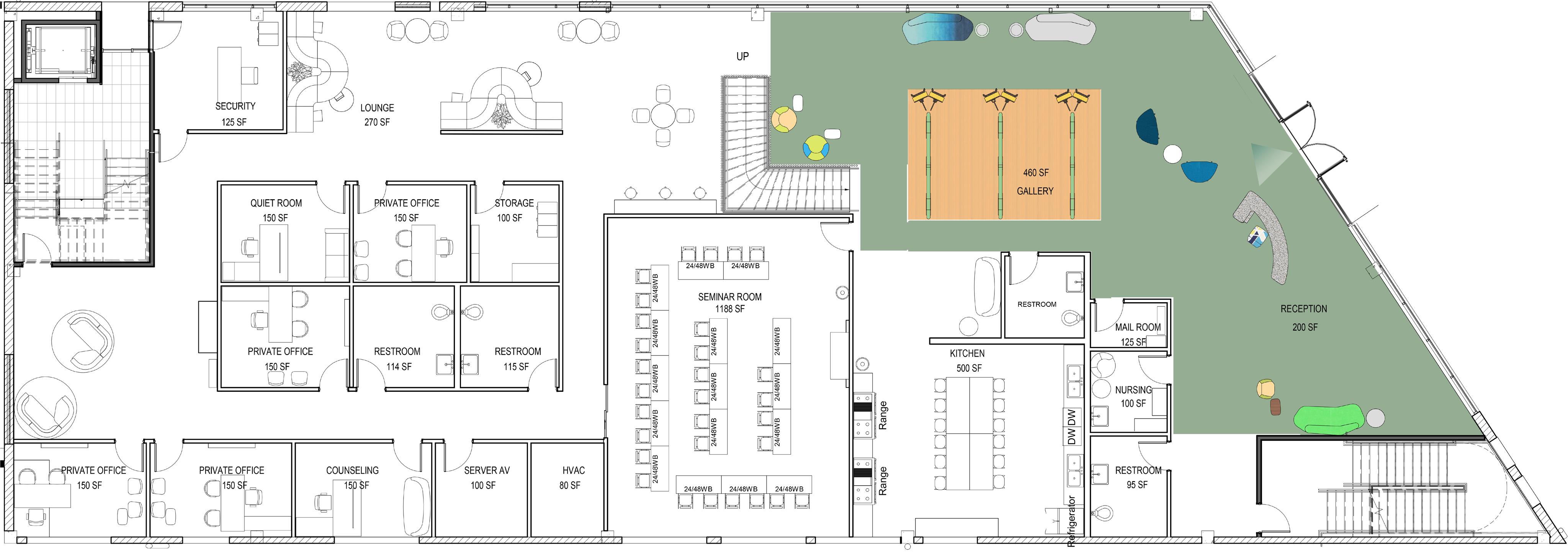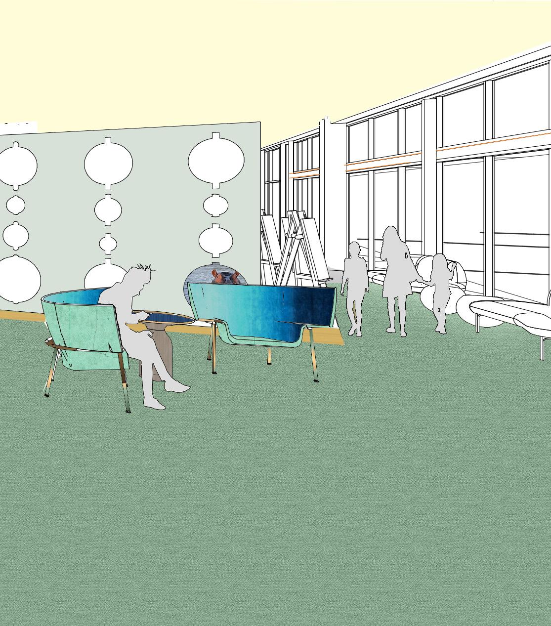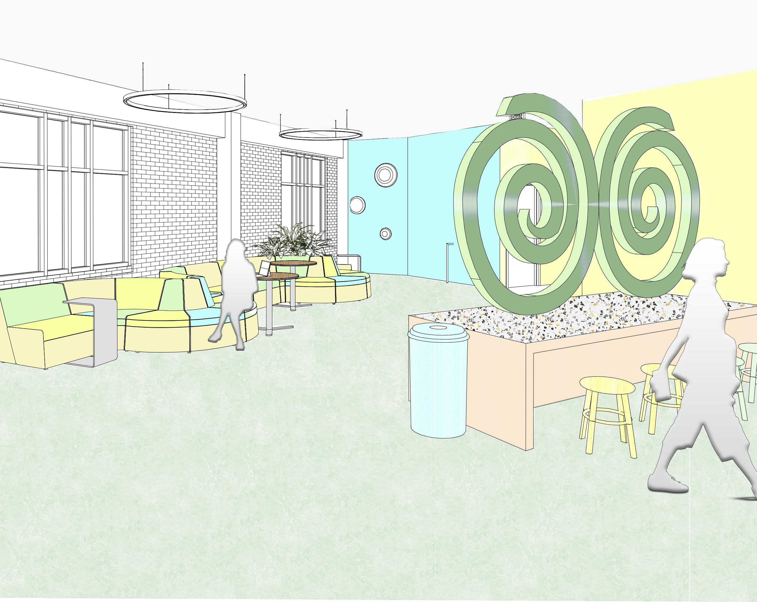 On this new journey, residents are adjusting to their transition back into society. The lounge space provides the residents options to choose their social mood. This area emphasizes the importance of choice, peer support, and collaboration.