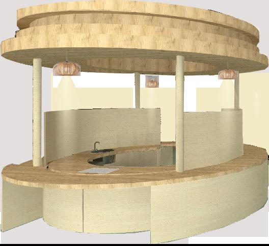 KIT-OF-PARTS KIOSK Canyon roof made from raw wood material and mimics the shape of layered canyon walls The pole and wall divider act as supports for the roof, made from cork veneer travertineemulating LED lighting illuminates through the Rattan shade SUSTAINABLE FEATURES 21