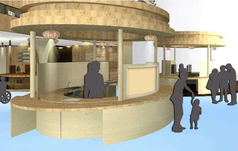 FOOD & DRINK KIOSK The design for the food and drink kiosks are inspired by the lower Pecos region canyonlands and act as the foundation for the proceeding hospitality and retail areas. The kiosks are designed as a kit-of-parts and are made from sustainable materials that are locally sourced.