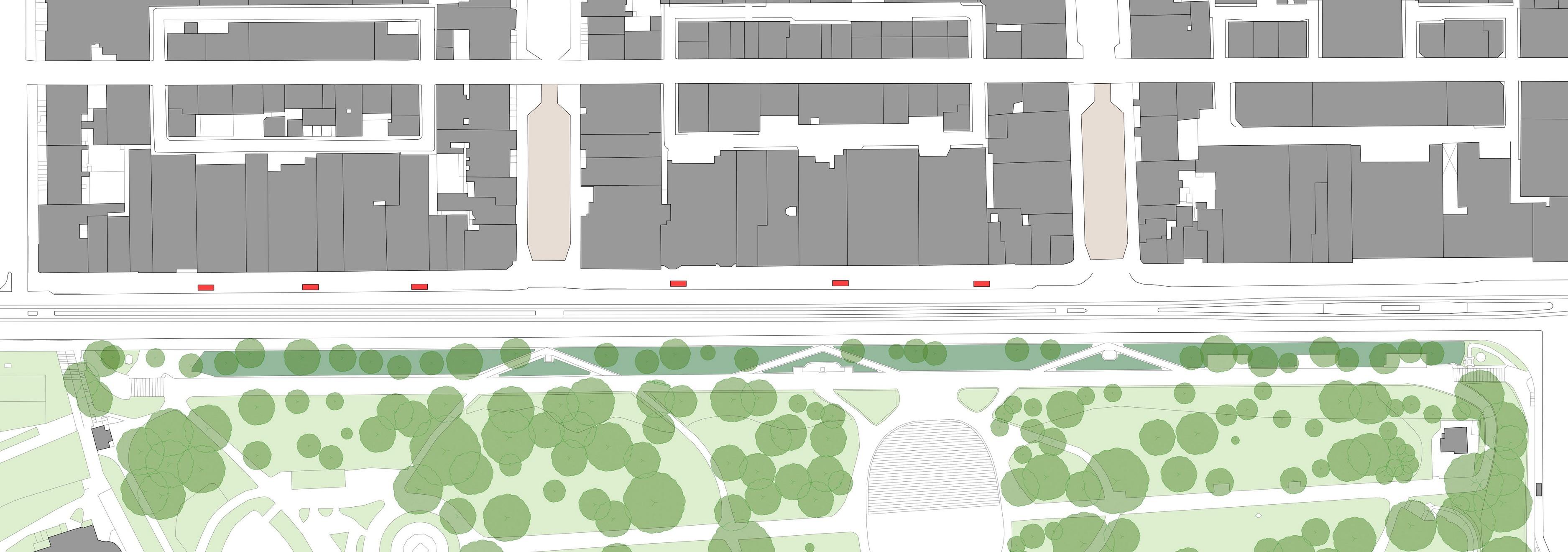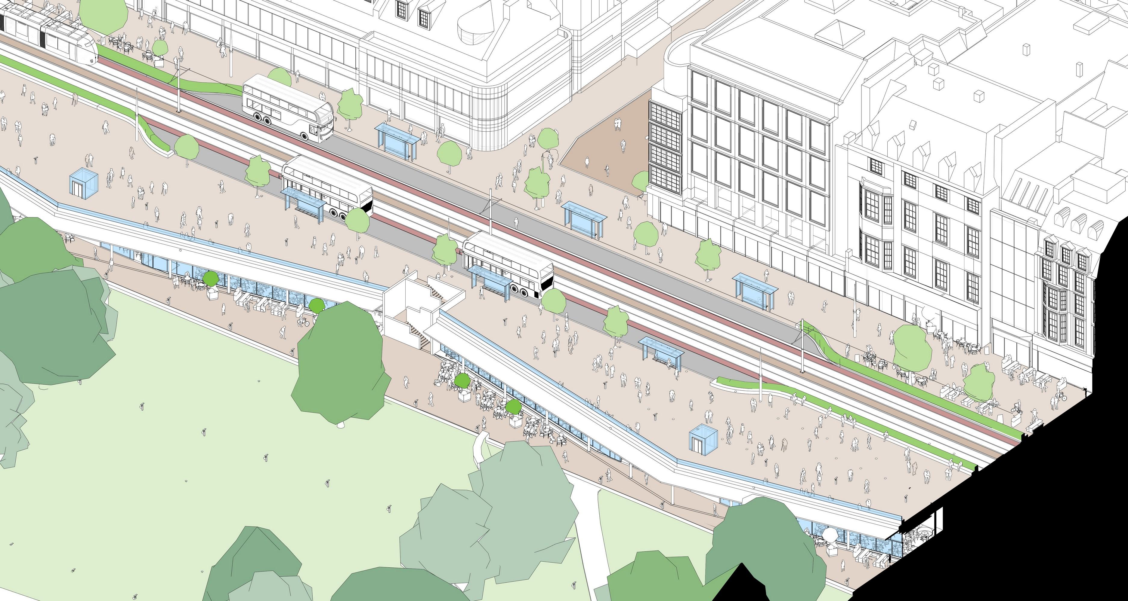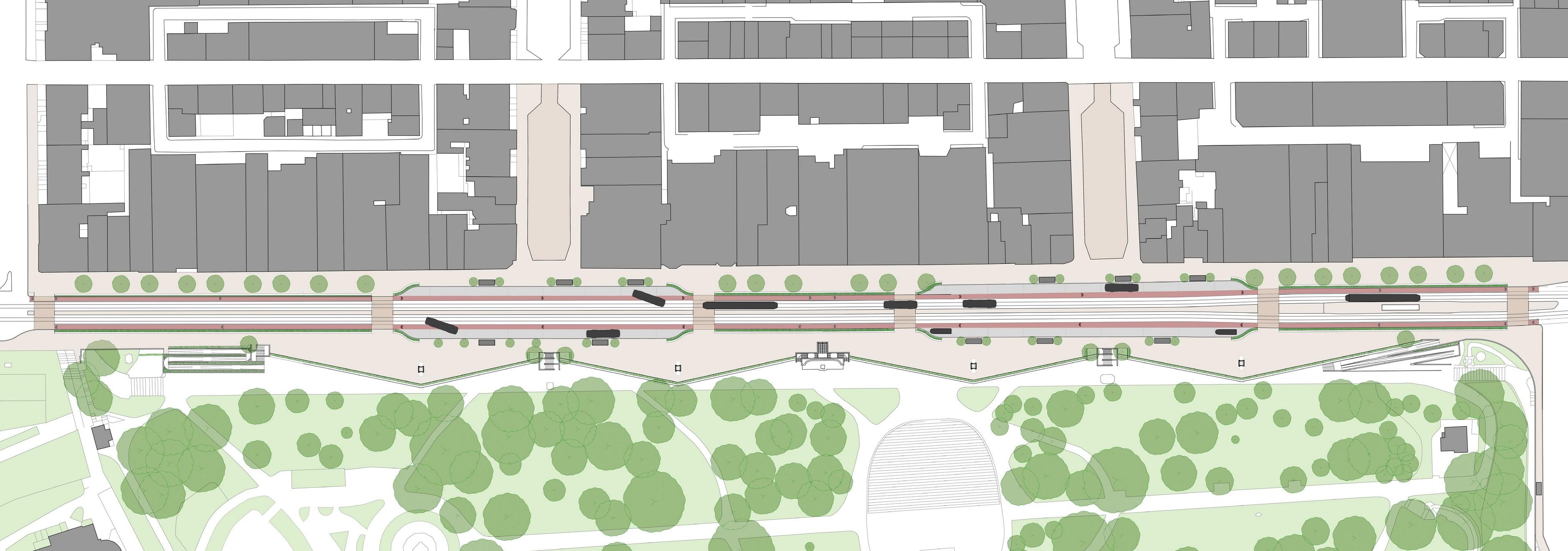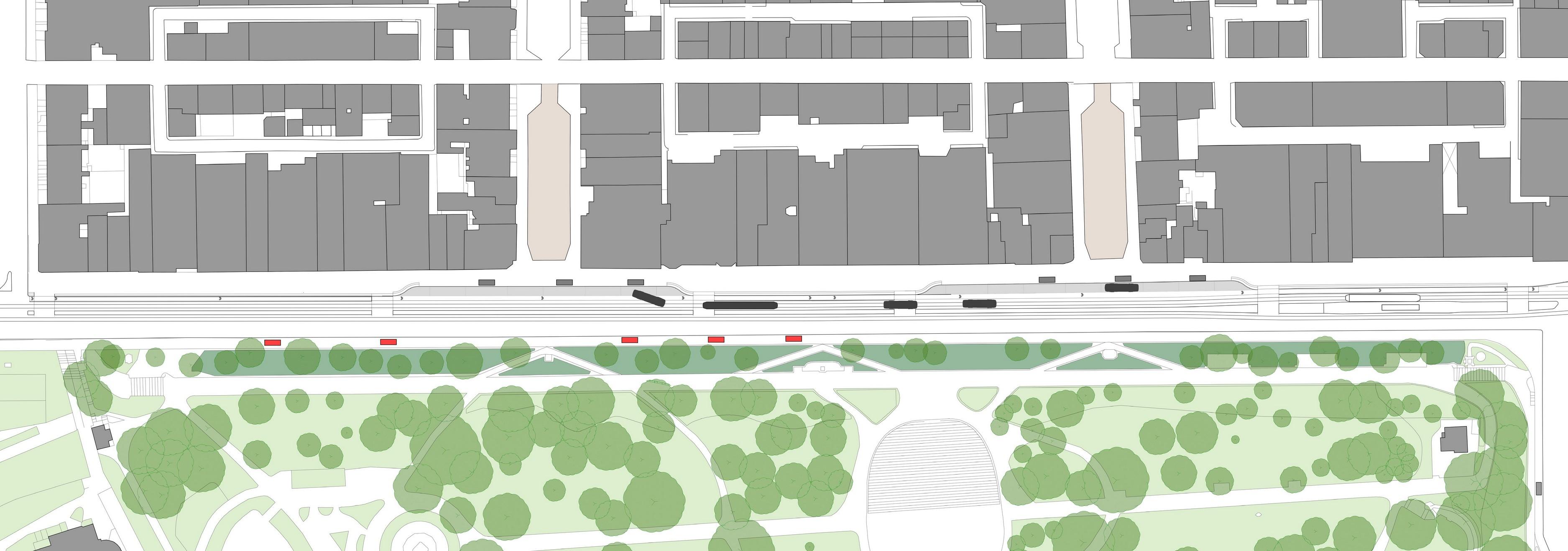 >Proposed grouping of 3 Bus Stops on the north side on the axis of Frederick Street. There is space for two buses per stop.