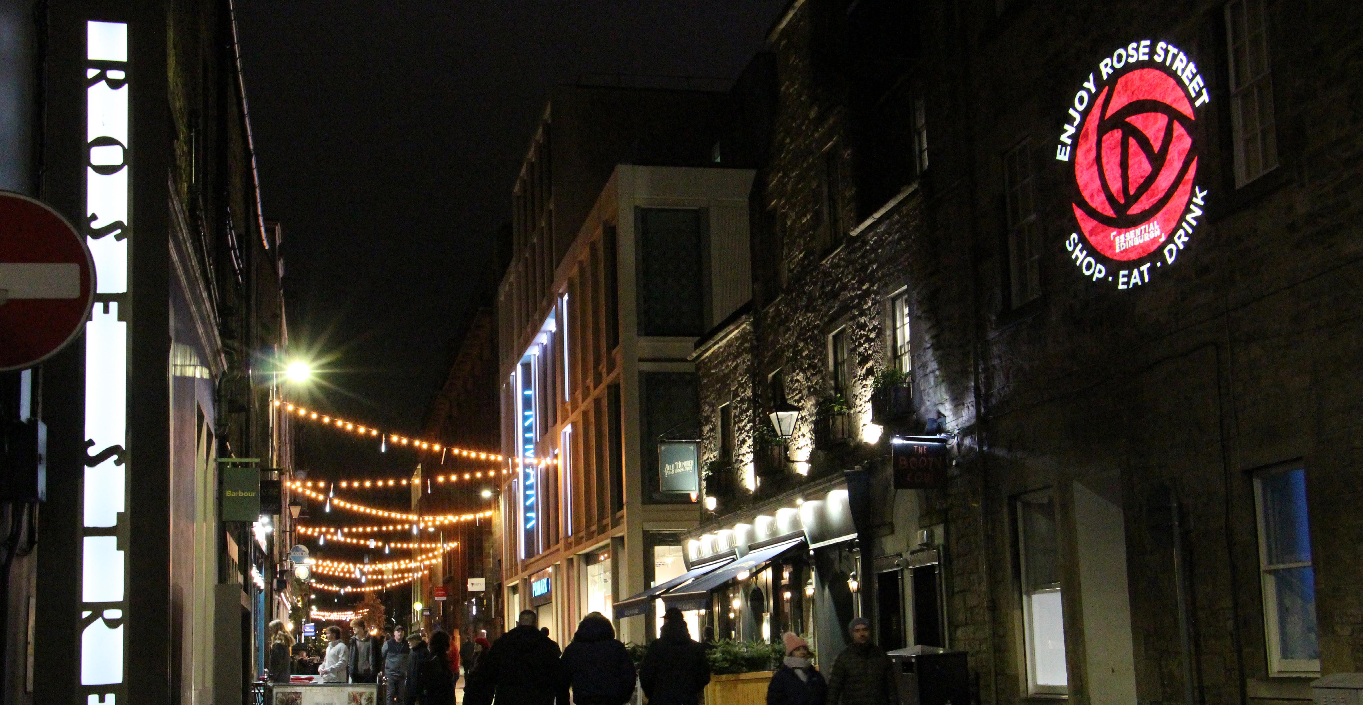 Our year-round light strings on Rose Street, enhanced at Christmas with around 100 icicle drop lights, bring much needed illumination during the darker autumn and winter months. The lighting strings are in addition to our gable end projectors, using custom designed gobos.