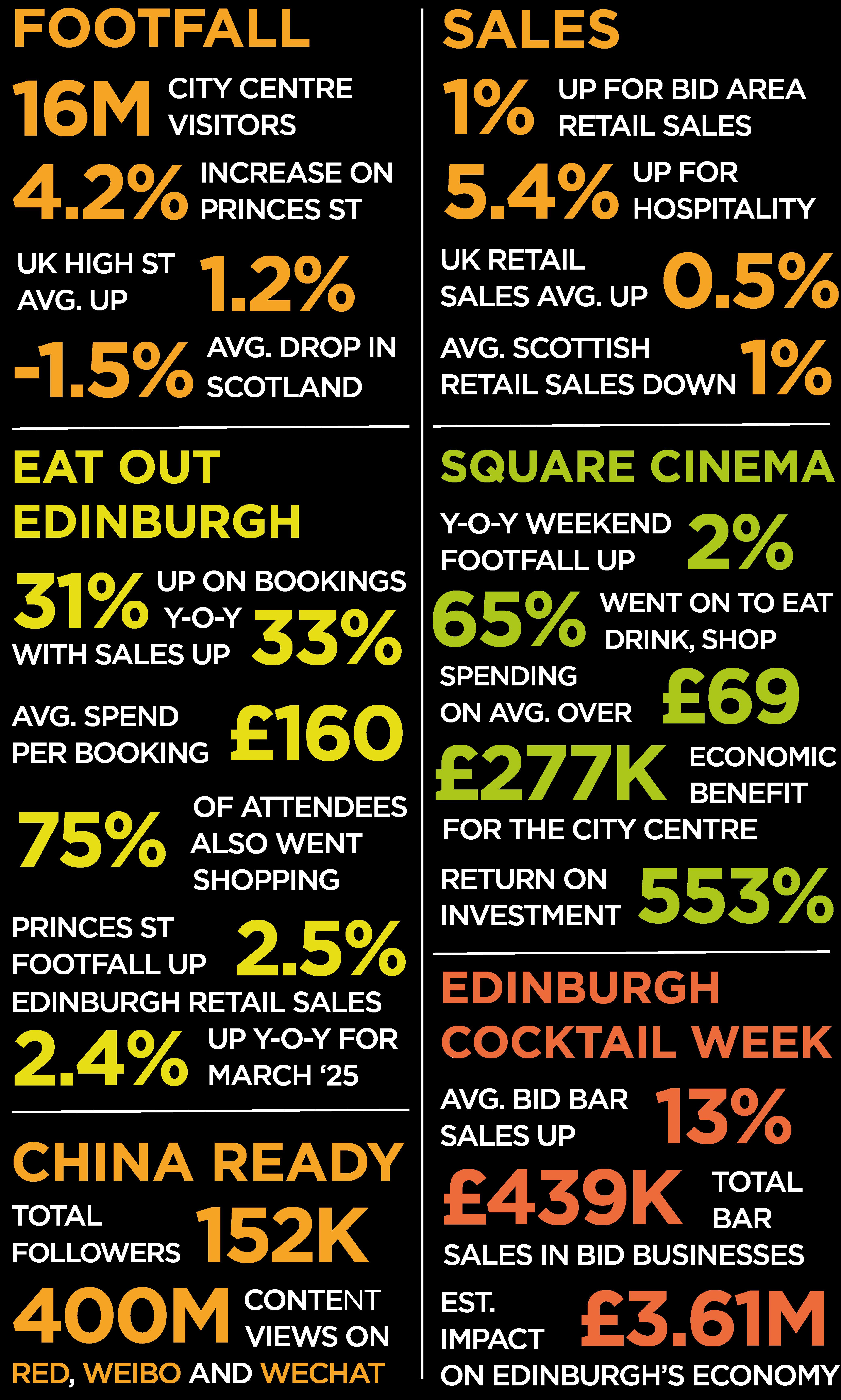 • Footfall on Princes Street up 2% on same weekend in 2023 and up 7% on 2022