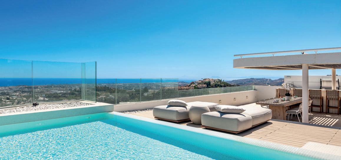 La Quinta: Exceptional penthouse with unrivalled views and private pool within the exclusive gated community of The View. 3 beds, 3 baths, living area approx. 218 m², terraces approx. 281 m². Price €2,995,000, E&V ID W-02WBRF