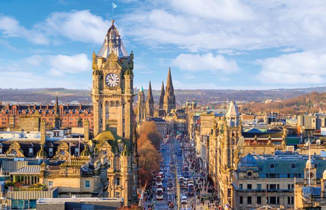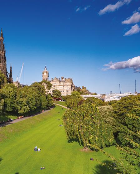 striking piece of modern architecture juxtaposed to its more elderly neighbours. From here, you can stretch your legs further around Holyrood Park, an array of hills, lochs, and cliffs surrounding Arthur’s Seat and Salisbury Crags, a piece of wild Highland landscape only a mile or so from Edinburgh’s city centre. If you do mount the Crags or amble around the park, carry on to the village of Duddingston and have a pint in The Sheep Heid, the oldest surviving public house in Scotland, established in 1360, which is also good for food. ›