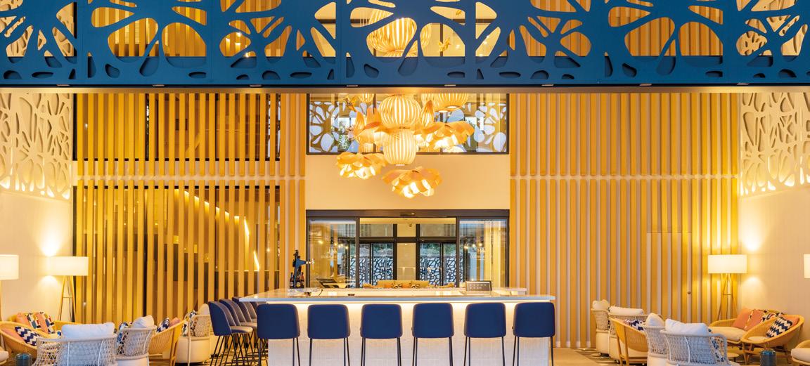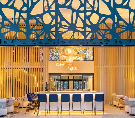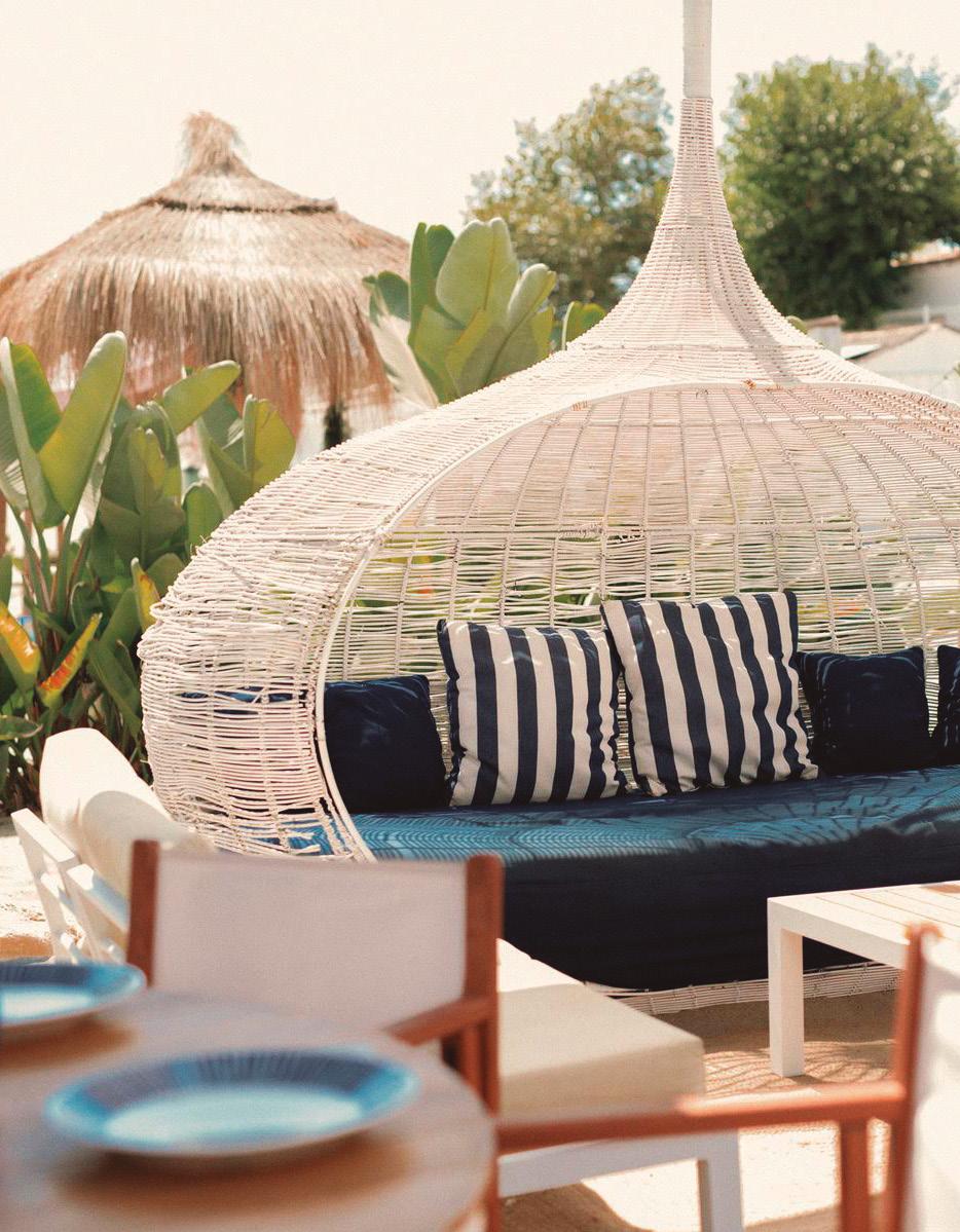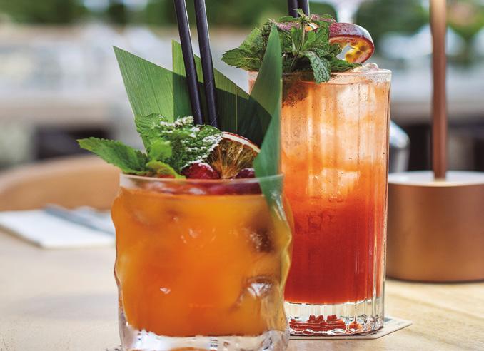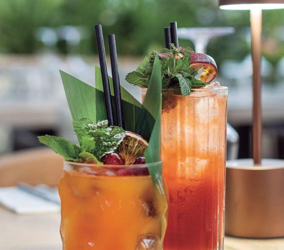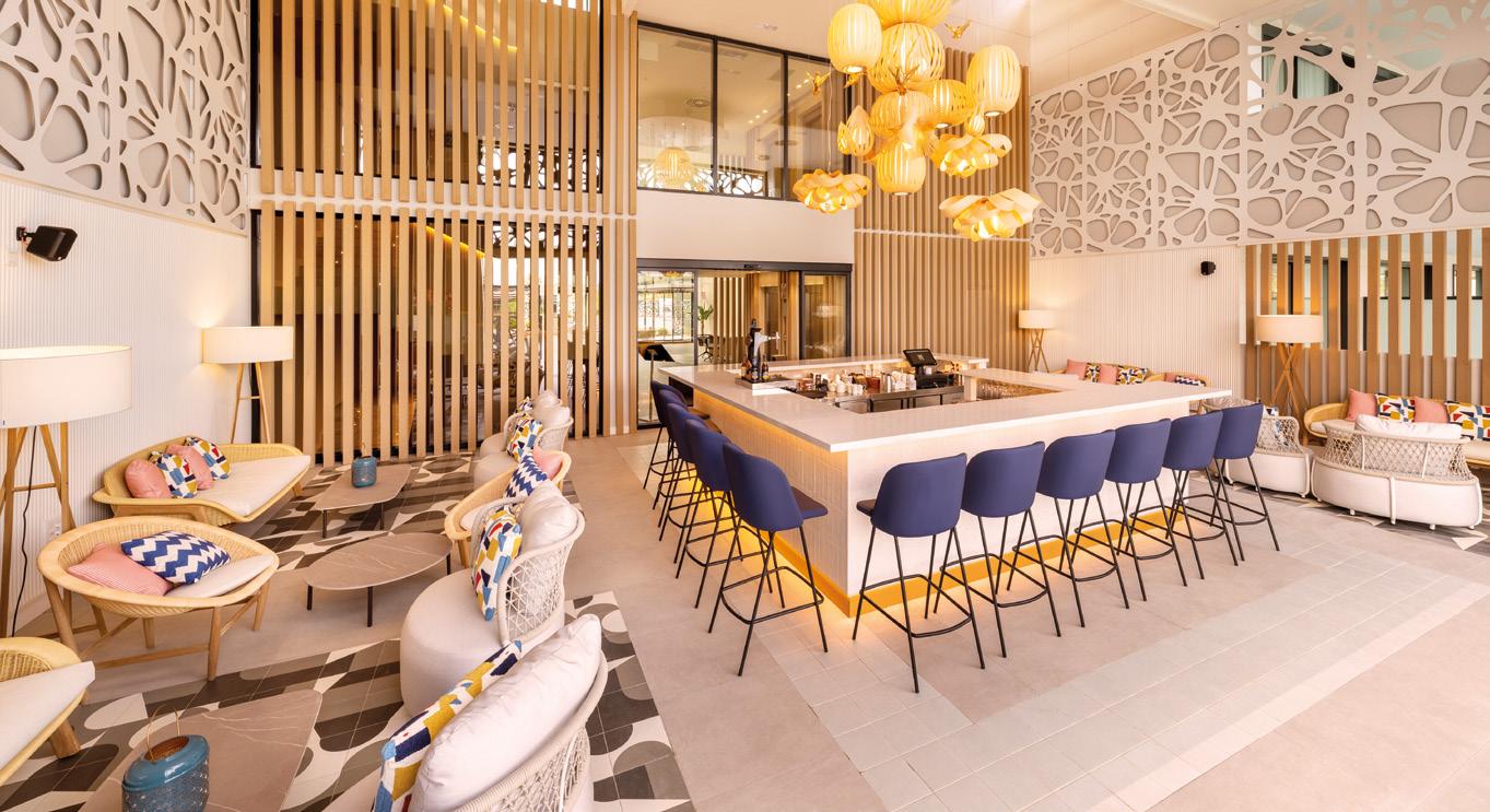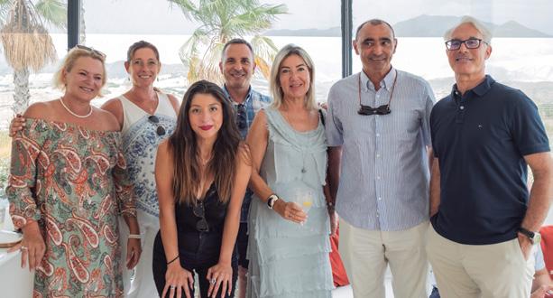 reception on entering the club and offers three main dining zones: a sophisticated interior seating area with a window view to the spotless kitchen and a large glassed-in wine cabinet on the facing wall. The impressive gabled wooden roof continues over the inner terrace sheltering an island bar immediately beneath it. This extends to the spacious outer terrace, which has plenty of shade sails and elegant Taittinger umbrellas for protection from the sun. The extent of the venue can easily accommodate large private events.