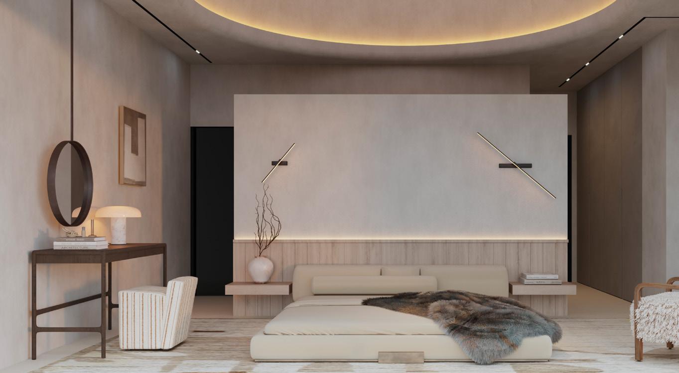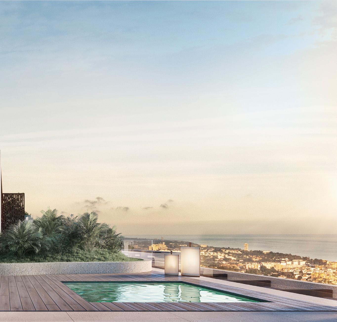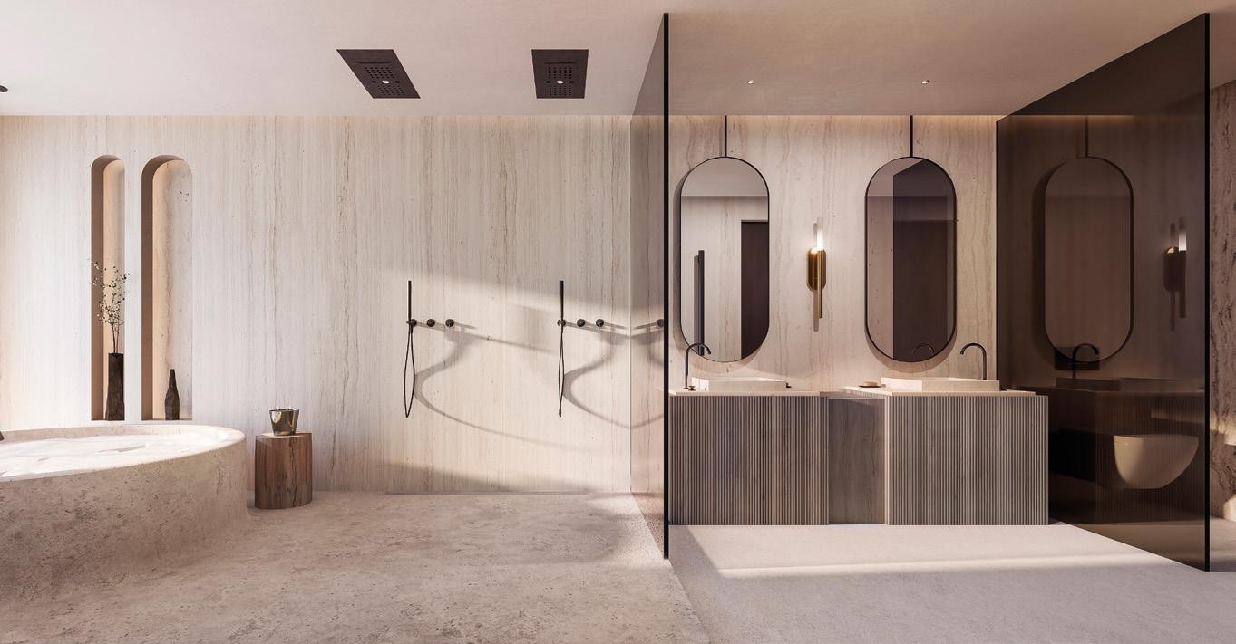 The grand entrance and double-height foyer with sweeping staircase lead to the upper floor which hosts the spacious main suite with sitting area, dressing room, office and private terrace with expansive views. The main level hosts a cozy lounge, dining and TV rooms, elegant kitchen and 3 bedroom suites, all with wrap-around terraces.