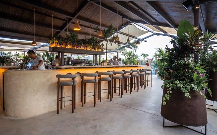 The décor is very natural with organic shapes, stone and wooden tables with brushed wood chairs, soft cushions and sofas. Tropical plants and planters are everywhere, shielding the terrace from the paddle courts and providing a plethora of segregated partitions and alcoves for greater privacy. ›