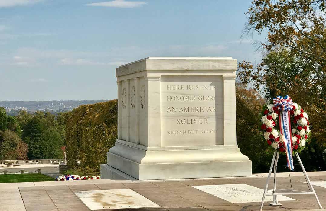 The Tomb of the Unknown Soldier, Arlington National Cemetery's most iconic memorial, stands atop a hill overlooking Washington, D.C. The neoclassical, white marble sarcophagus depicts three carved Greek figures representing Peace, Victory, and Valor.
