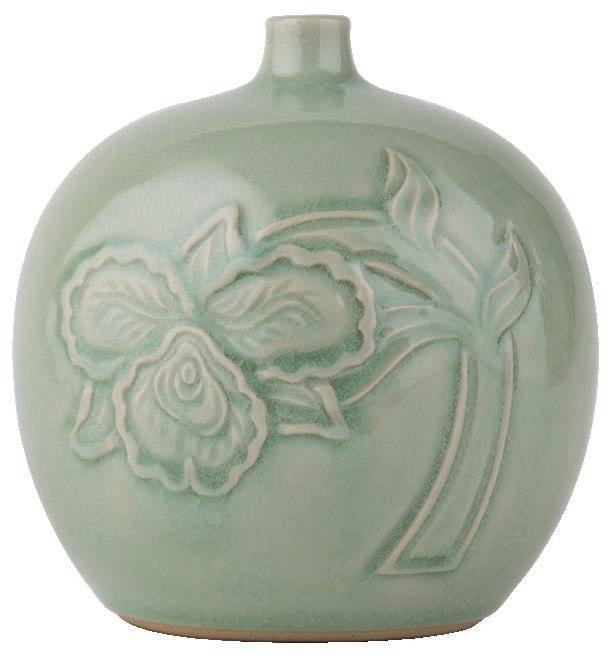 Handcrafted by Thai artisans, the orchid motif seen on this green celadon vase is chosen for its association with complex and exquisite beauty.