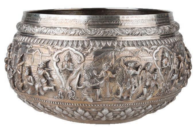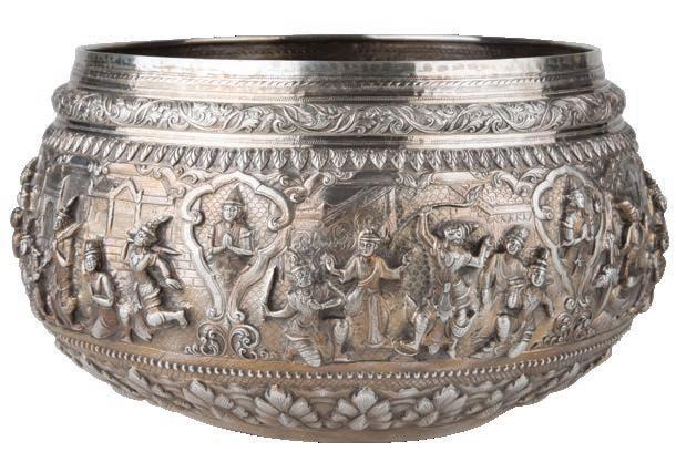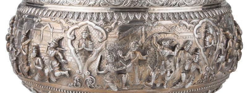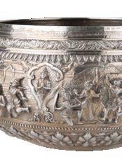 The silver repoussé bowl from North Thailand are fashioned after Myanmese high-relief designs, depicting characters and symbols from the Buddhist Jataka Tales and the Hindu Ramayana.
