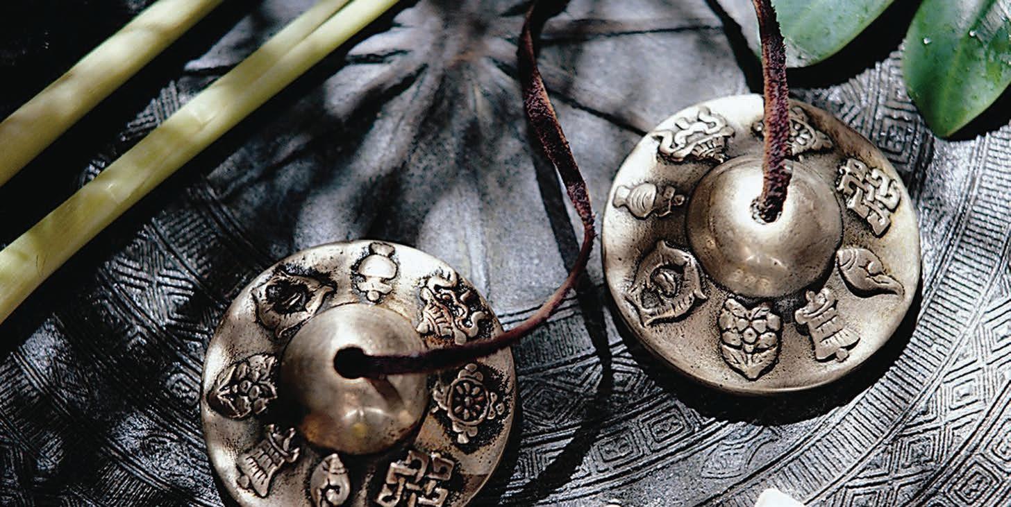 Solid brass bells are used to signal the end of spa treatments, seen here displayed on a bronze Vietnamese ra in drum.