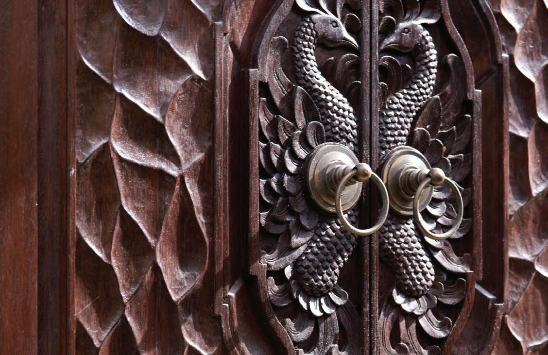 As intriguing as any artwork, carvings of mythical birds, created by local Balinese artisans adorn these impressive doors.