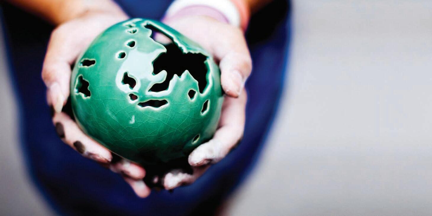A pair of hands support planet Earth, a reminder that we must be united and nurture our children to be tomorrow’s leaders, as we strive to make the world a better place.
