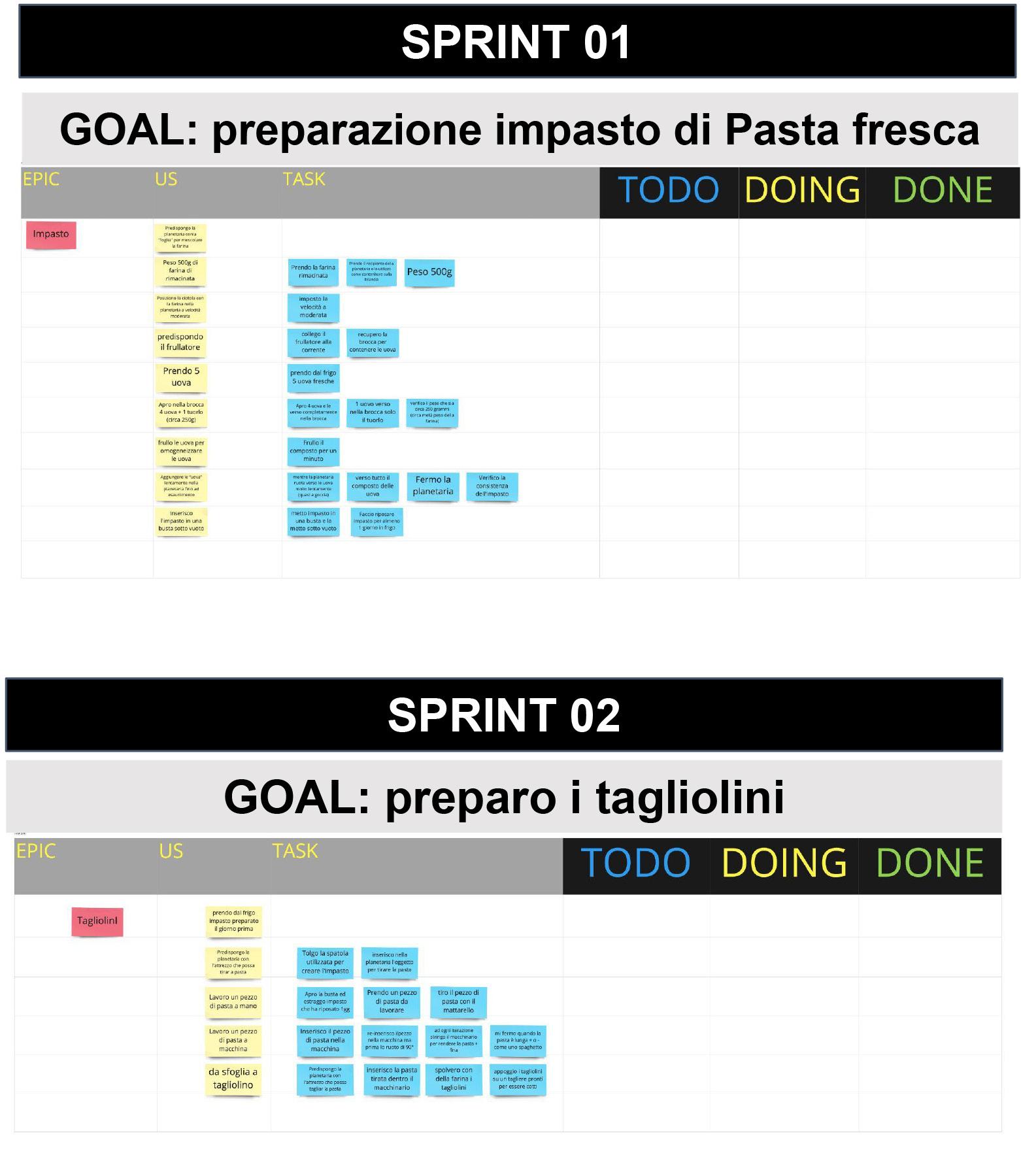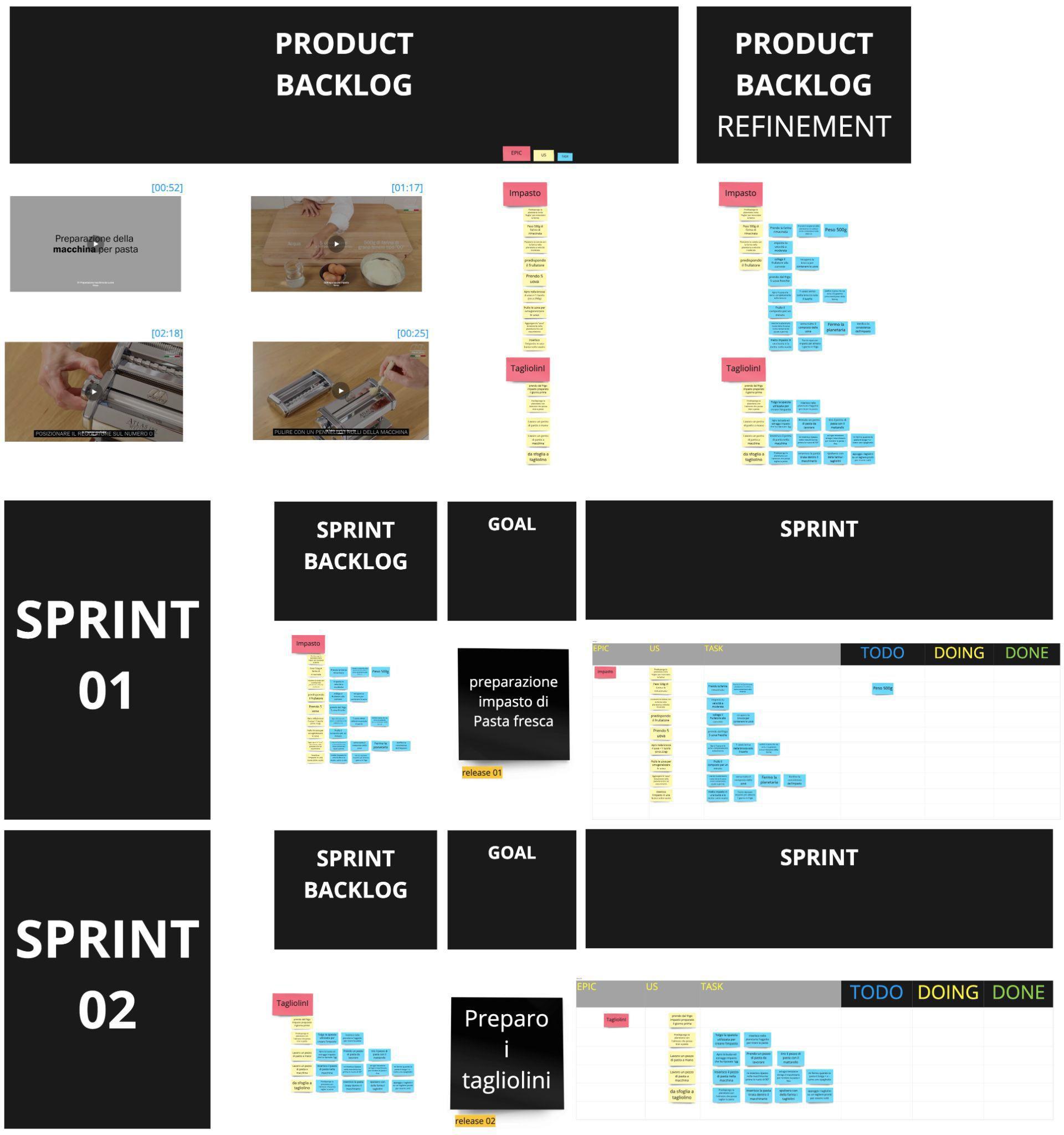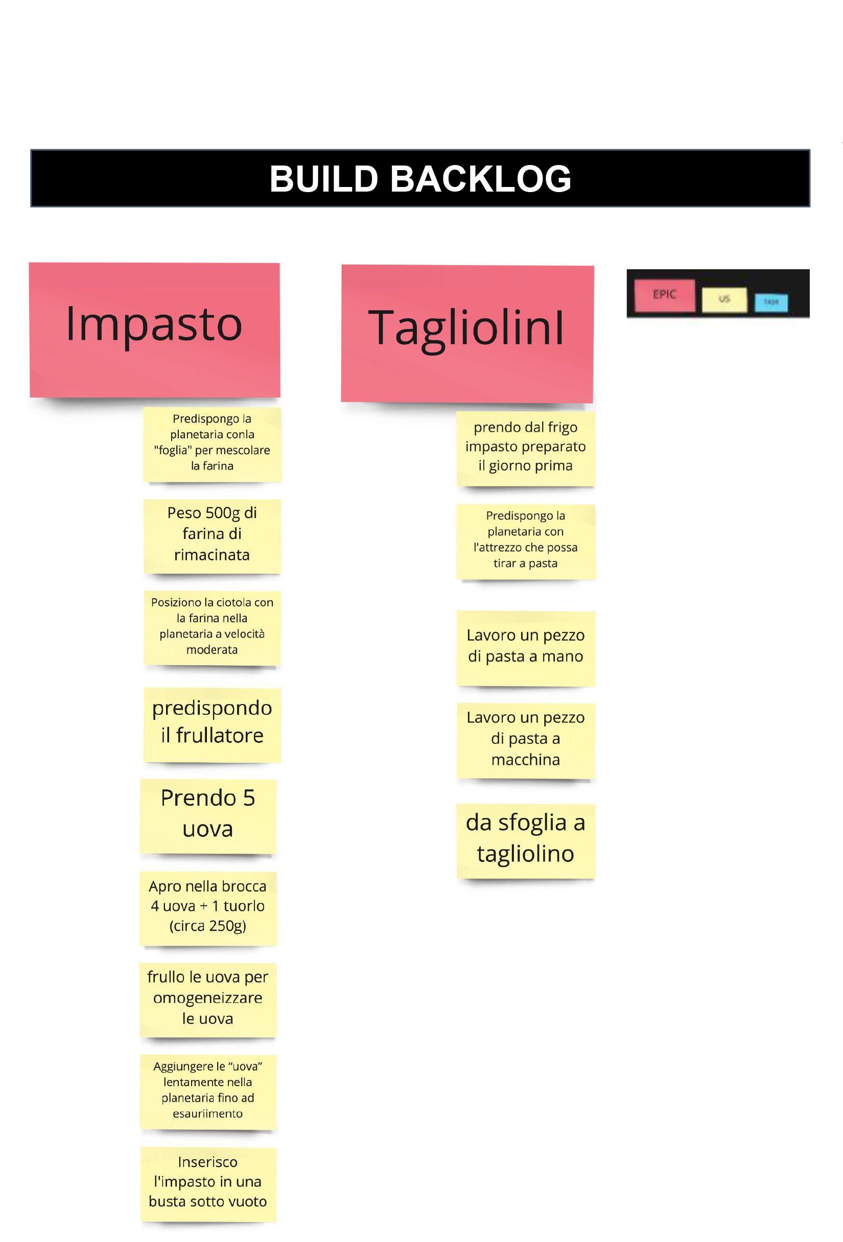 Build backlog: durante questa fase non si toccano attrezzi o alimenti, ma si crea una board dove si organizzano e dettagliano le cose da fare.