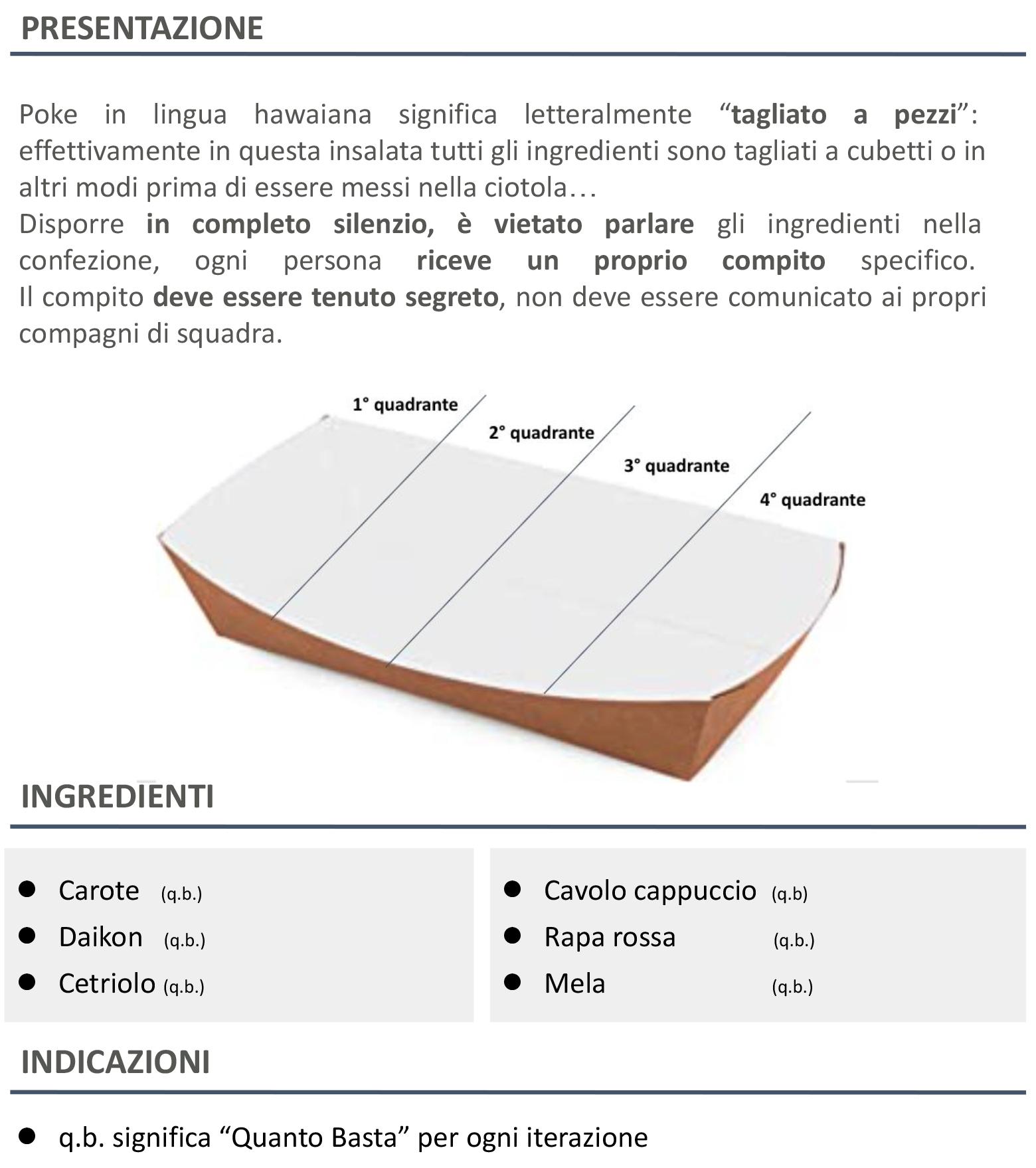 Iterazione: il team costruisce insieme quanto indicato nella ricetta, entro il tempo indicato, e rispettando i vincoli e le indicazioni.