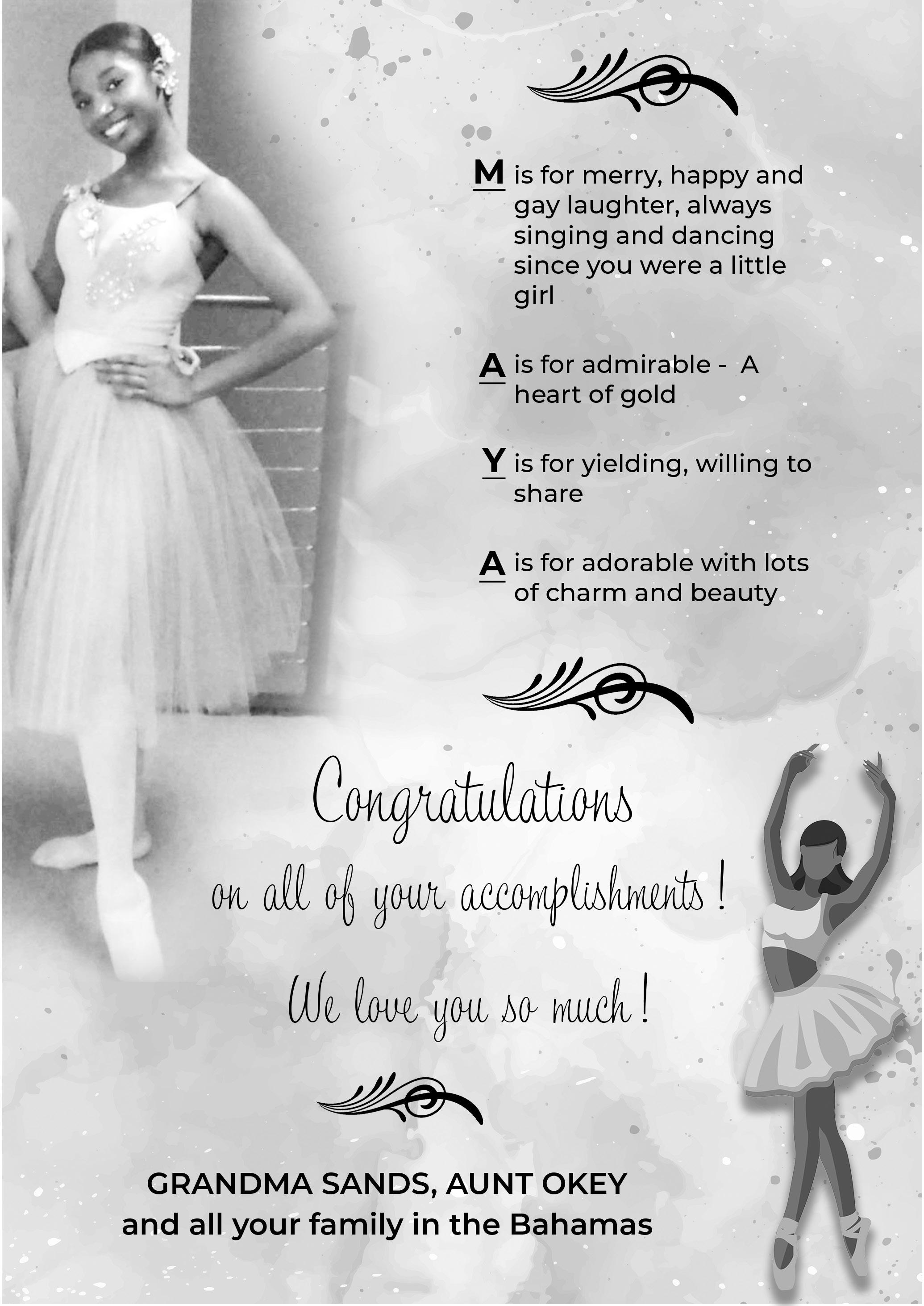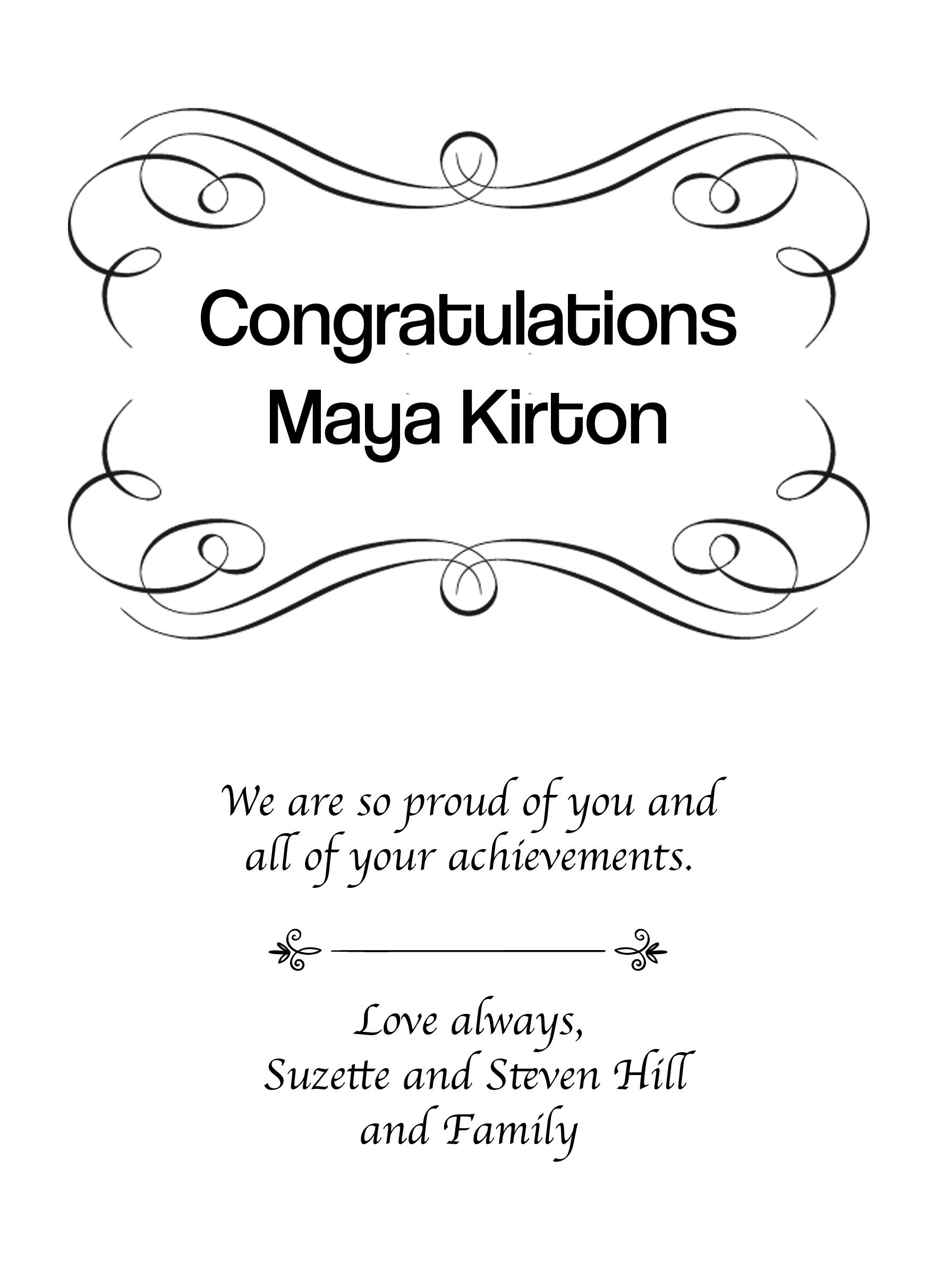 we congratulate you on your achievements and are so proud of you! Getting to know you and seeing you grow over the past years have been delightful.
