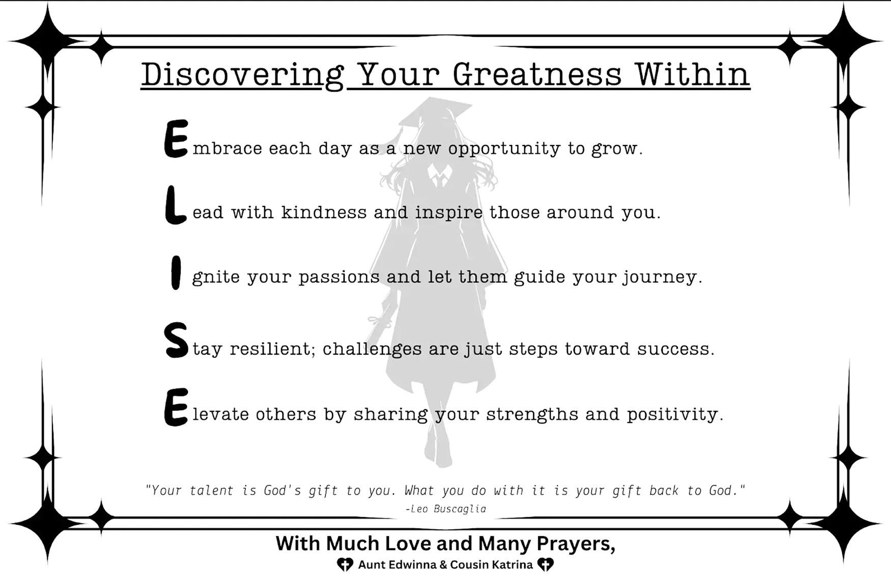 Your grace, intelligence, and kindness, embody the finest qualities of a young woman stepping into this new chapter. We are excited to see the bright future that lies ahead.