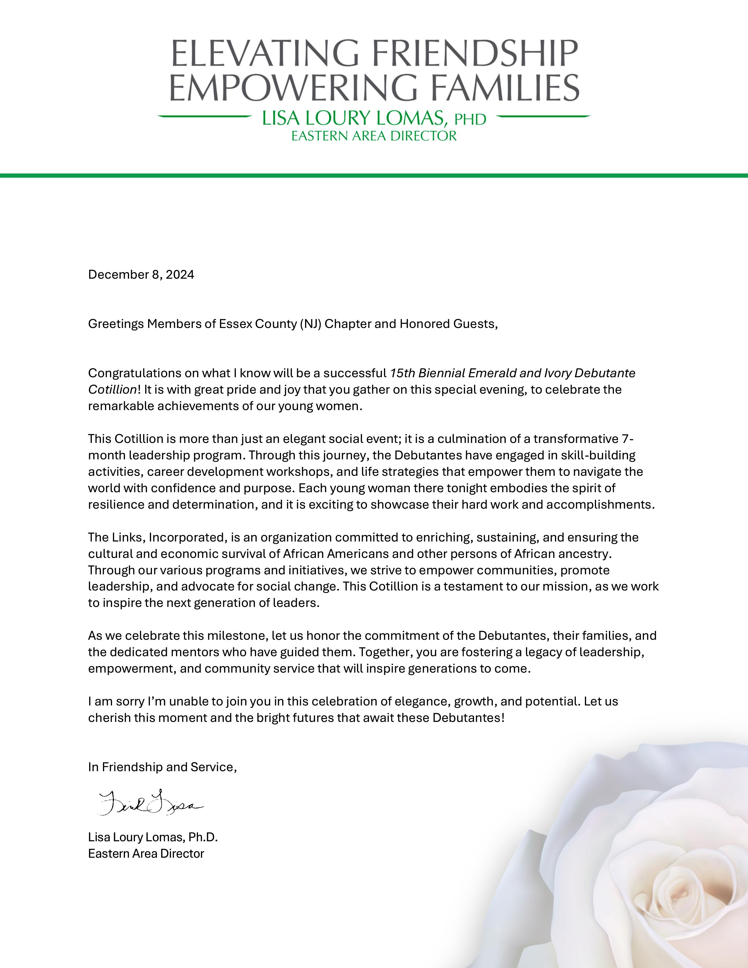 Congratulations to the Essex County Chapter (NJ) of The Links, Inc. as you celebrate the 2024 Emerald & Ivory Debutante Cotillion. The work of this important organization and its membership has been a source of growth and encouragement for generations of young people and their families.