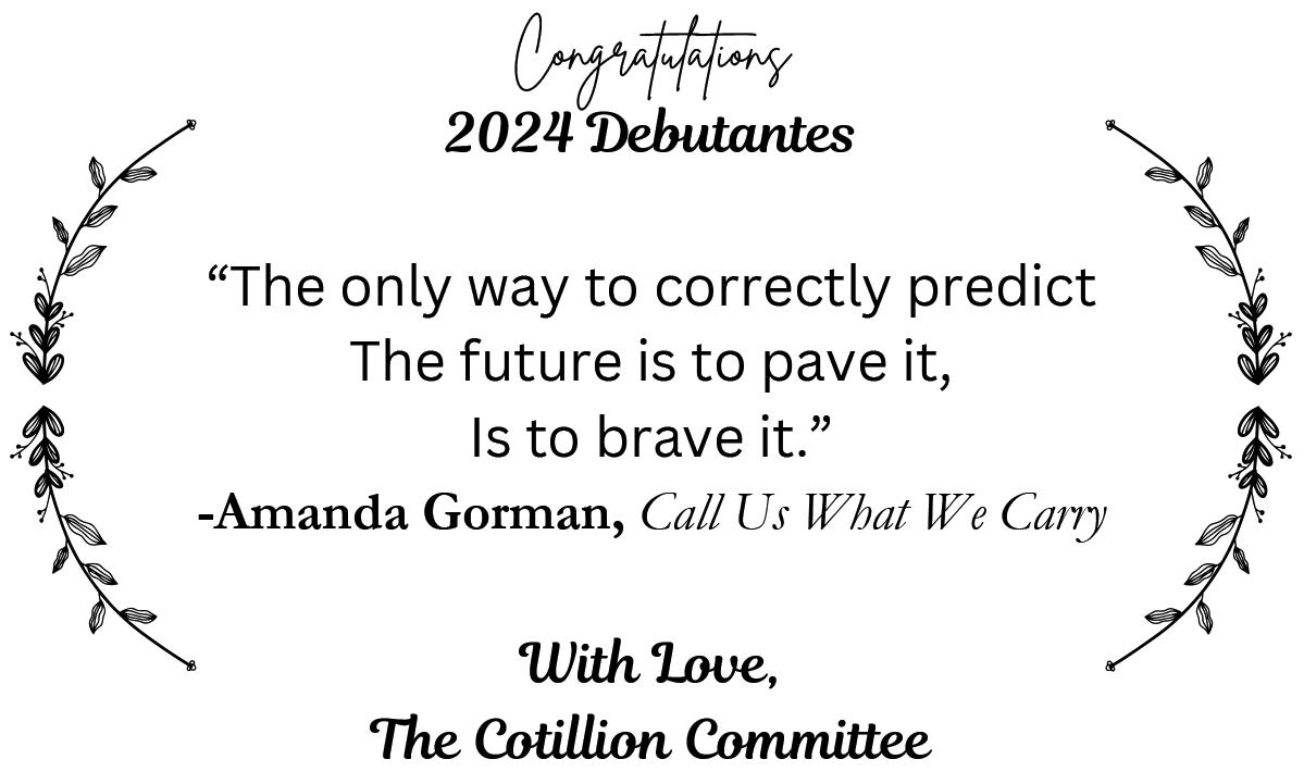 Greetings to the young women of the 2024 Cotillion. My name is Chloe Mason. I am your 2019 Emerald and Ivory Princess. It has been my distinct honor to wear the crown and I look forward to passing it along at the end of another wonderful debutante season. It brings me tremendous joy to hear that you will embark on this amazing journey, as this is near and dear to my heart. I want to be as honest as I can in saying when I was in your shoes I didn’t know what to expect, and quite candidly, I was unsure of where this journey would lead me. But must I say, it led me to the most beautiful community of talented and brilliant young women that I consider myself profoundly grateful to have met. We spent a considerable amount of time together, and above everything, we were each others’ biggest cheerleaders.