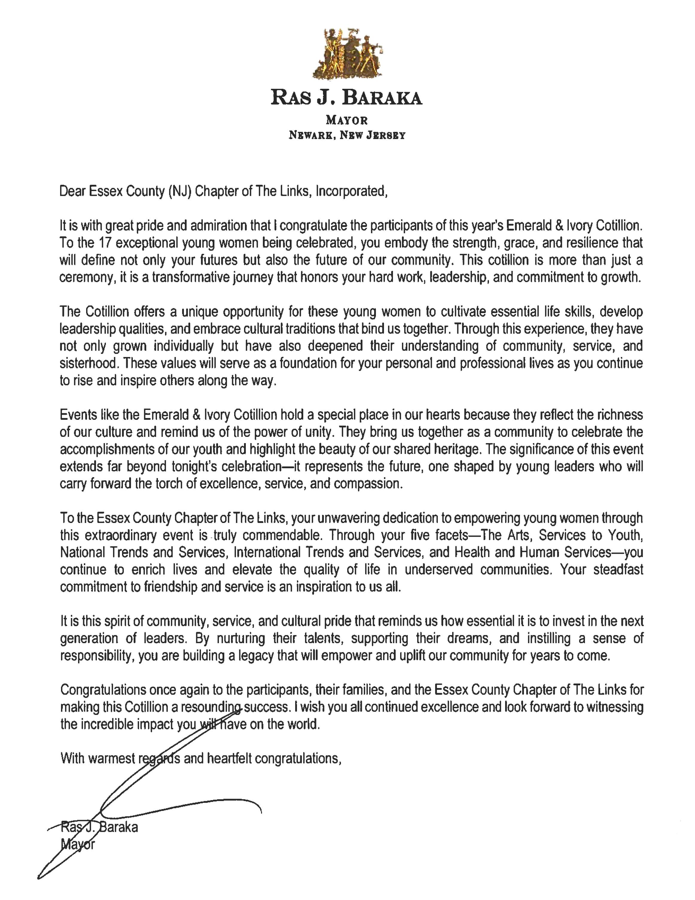 On behalf of the entire City of Orange Township, I salute the members, families and Debutantes of the Emerald and Ivory Cotillion, as well as the members of the Essex County Chapter (NJ) Chapter, The Links Incorporated for their important work in the community and for preparing future generations. I encourage all to join in their efforts as they continue "Leading with Excellence and Serving with Grace."