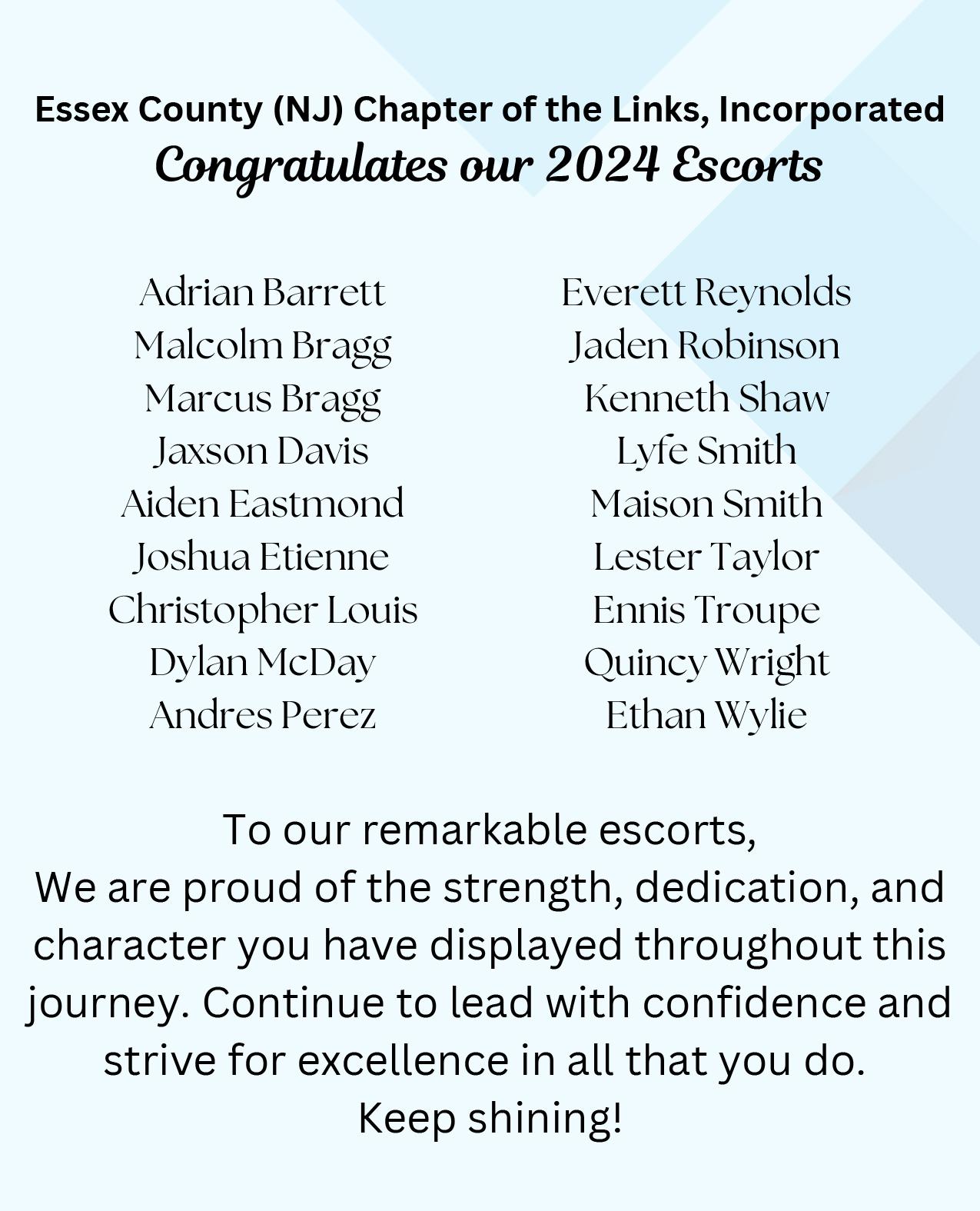 Congratulations to the 2024 Emerald and Ivy Debutantes and their Escorts. The Essex County (NJ) Chapter of the Links, Incorporated would like to acknowledge the Debutante’s on their completion of the 2024 Debutante Leadership Program.