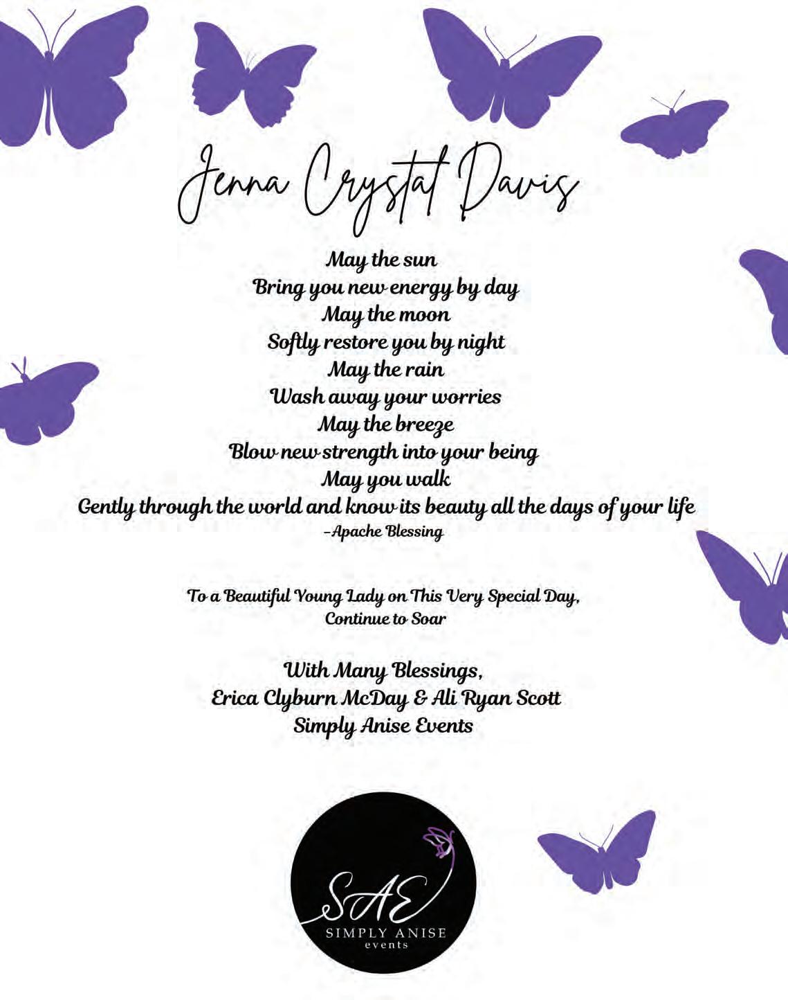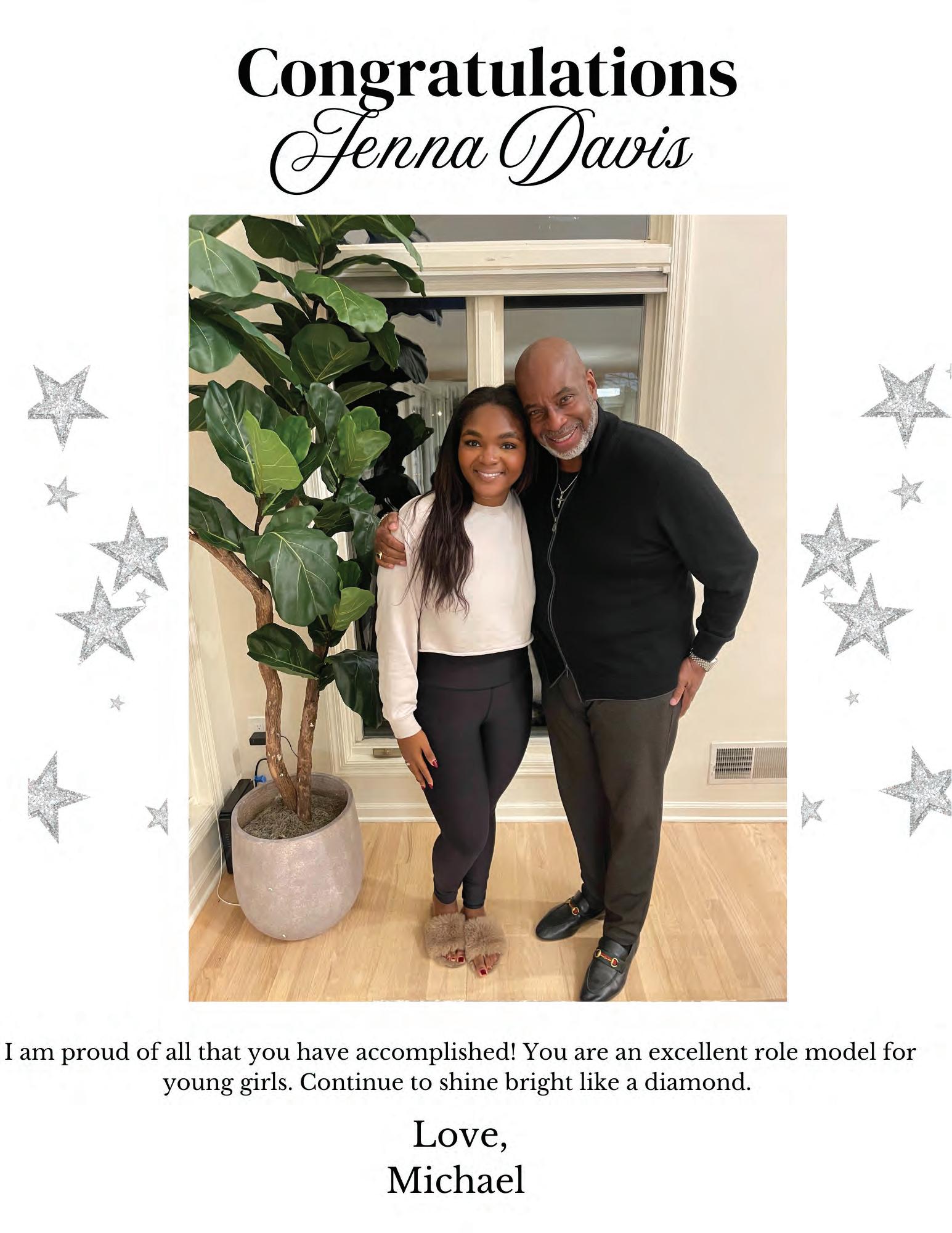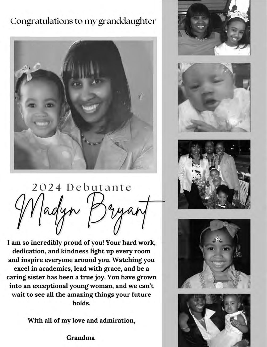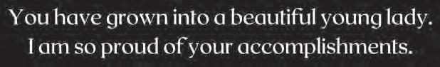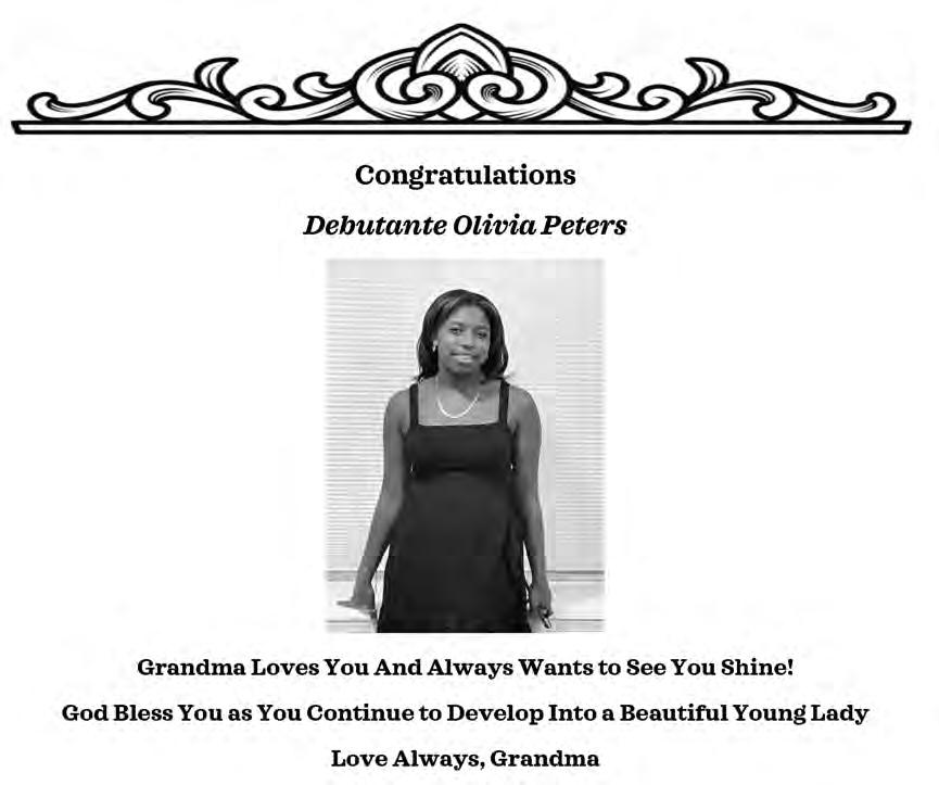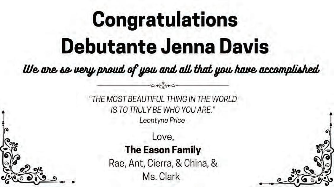We wish them the absolute best and encourage them to follow their dreams and aspirations in all that they do. Each Debutante and Escort has extraordinary talents and gifts that can make a huge impact and di erence in this world. Words cannot even begin to express how proud we are of them, and they will always have our continuous love and support.