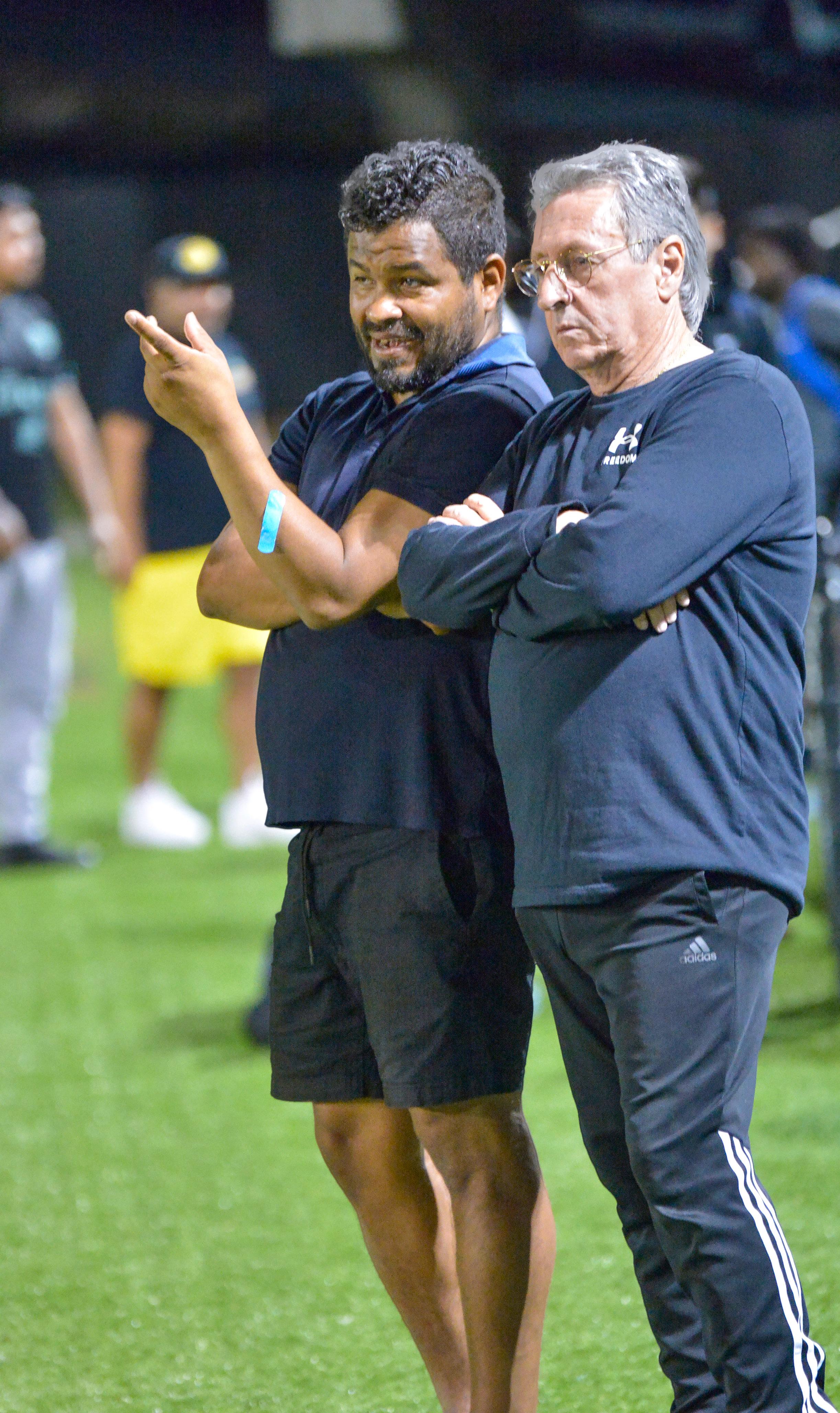 Óscar Oliva, más conocido como “El Mosco”, aparece a lado izquierdo, conversando con Rafael Salerno en el juego en el que Chalate FC venció 5 x 0 a San Luis el domingo en Silverbacks Park