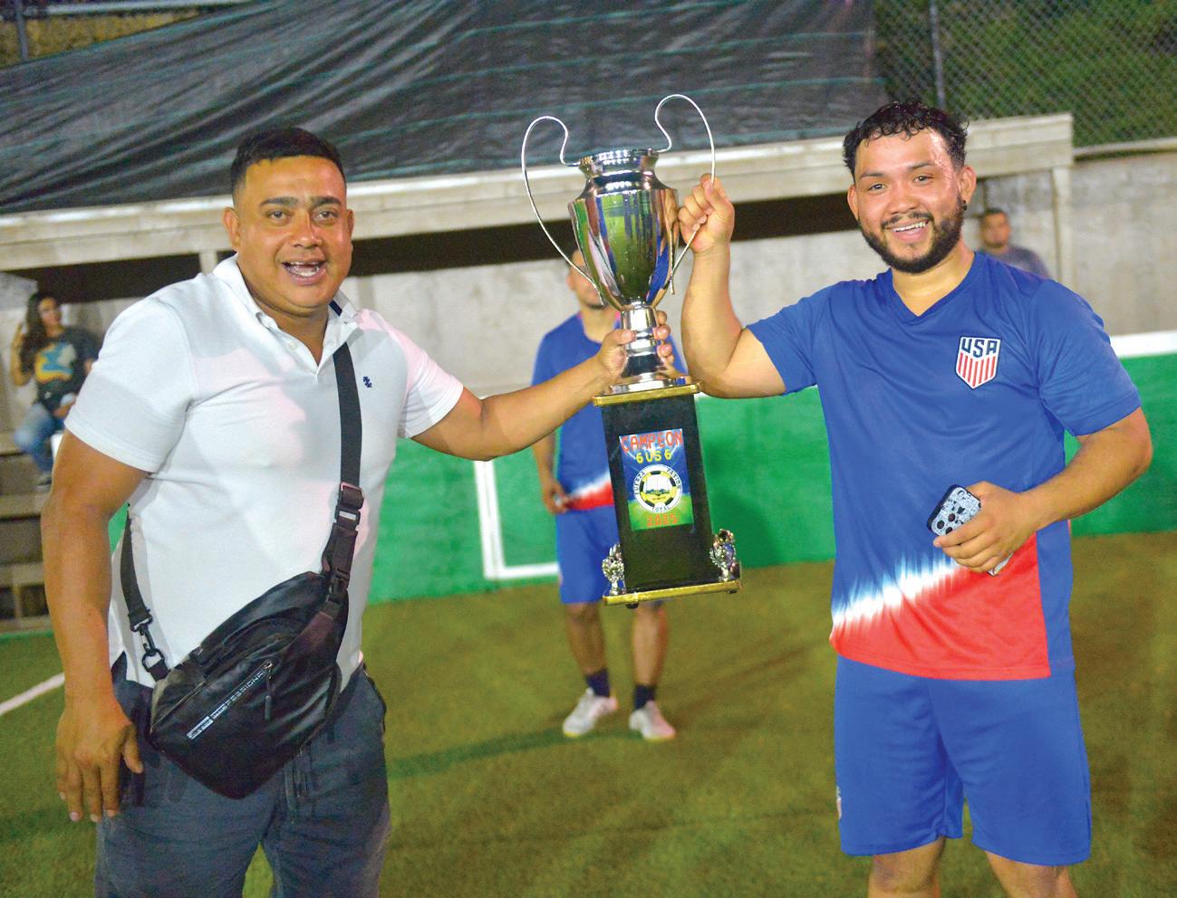 Óscar Gallardo, propietario de la Liga Fútbol Para Todos, hace entrega del trofeo de campeón al representante del equipo Catrachos
