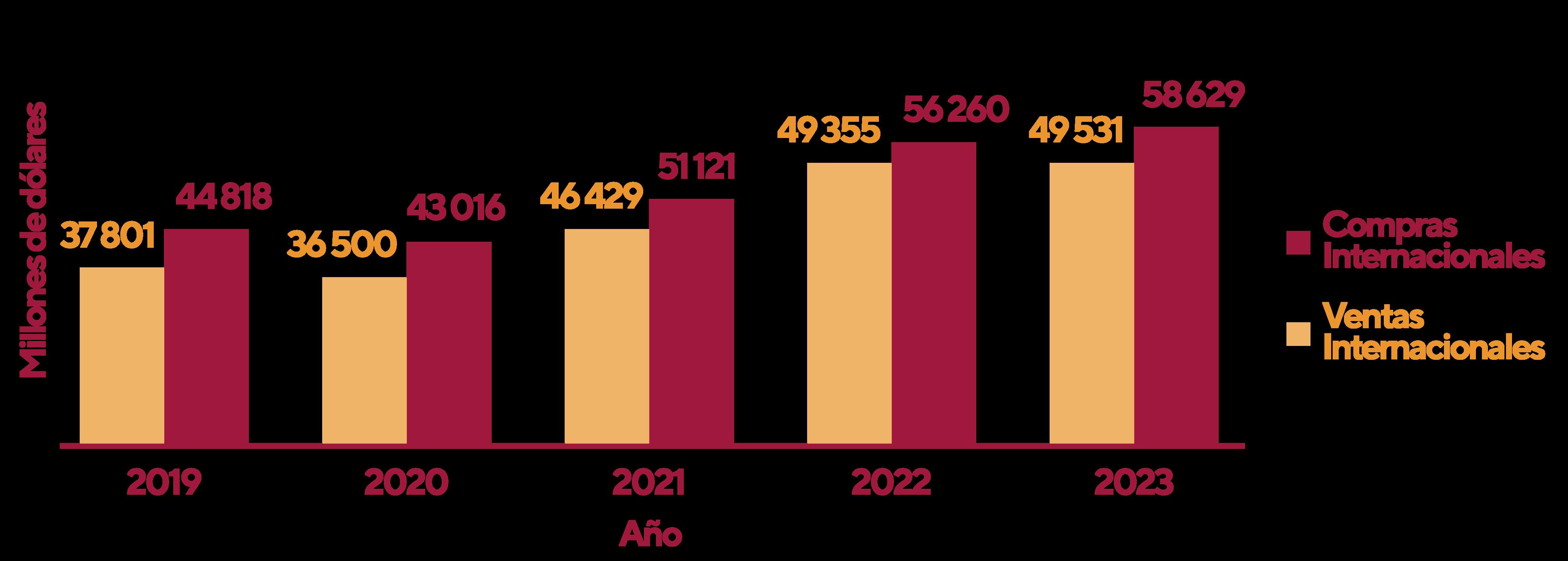 Por otra parte, las compras internacionales ascendieron a 49,531 MDD, con un crecimiento anual del 0.4%. Estados Unidos fue el principal proveedor con el 46.1% del total de las compras. China se ubicó en segundo lugar con el 25.2%, seguida de Corea del Sur con el 4.7%.