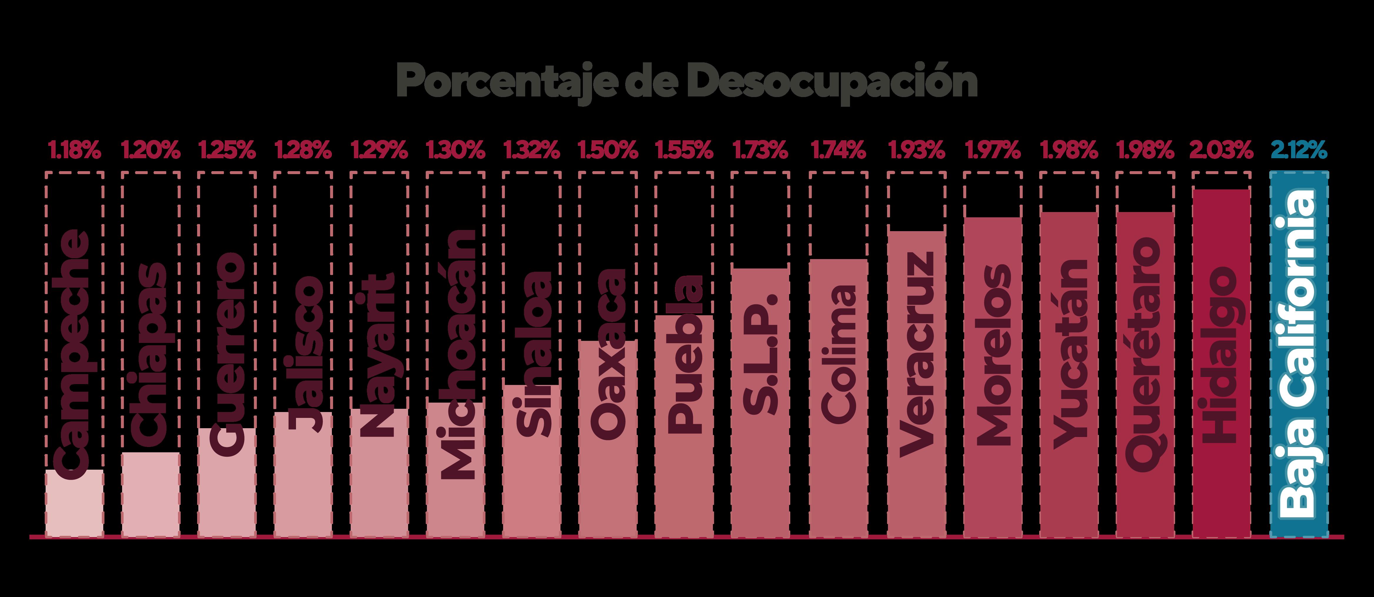 En febrero de 2024, el estado de Baja California experimentó una tasa de desocupación del 2.12%, ubicándose en el 17º lugar con la menor desocupación a nivel nacional. Esta cifra se encuentra por debajo del promedio nacional, que fue del 2.45%.