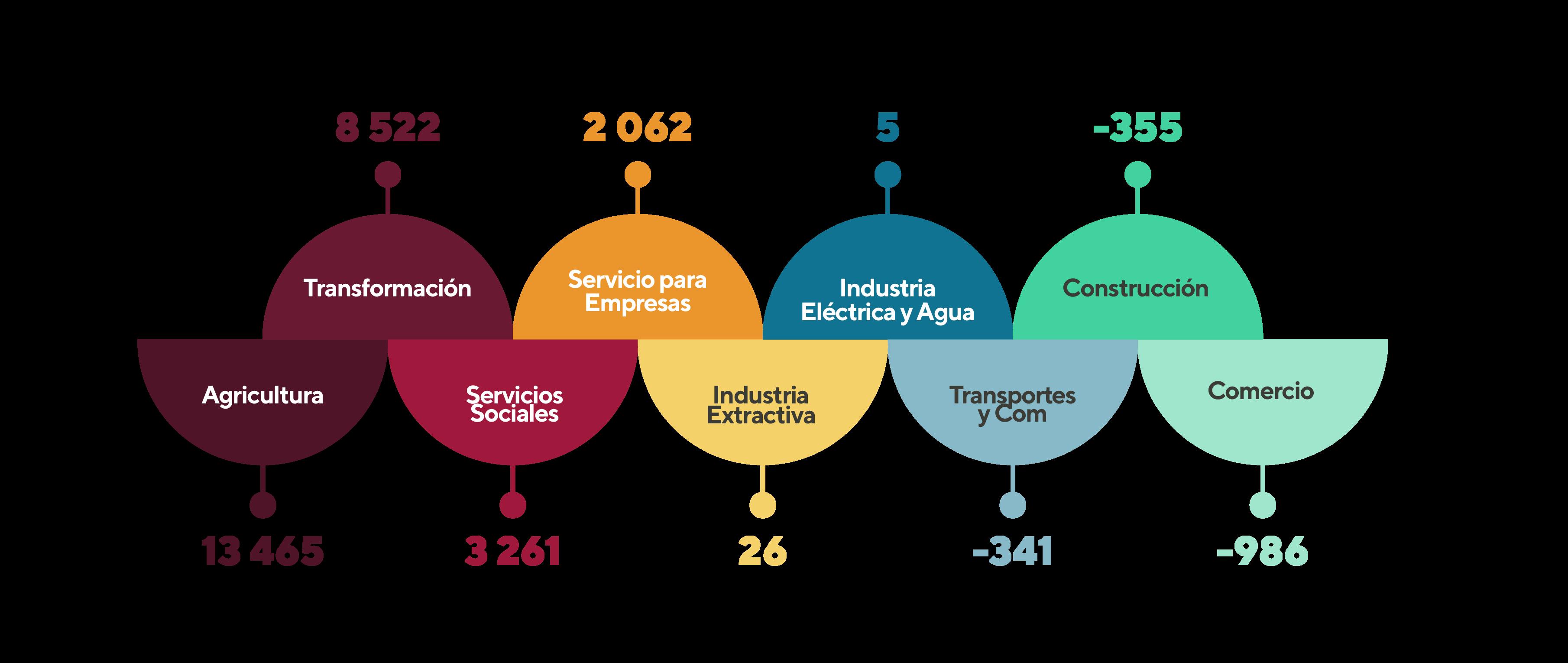 El sector primario se constituye como el principal impulsor de empleo, por segundo mes consecutivo, contribuyendo con 13 mil 465 nuevos puestos de trabajo, seguido por la la industria de transformación con 8 mil 522, principalmente.
