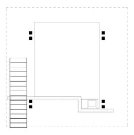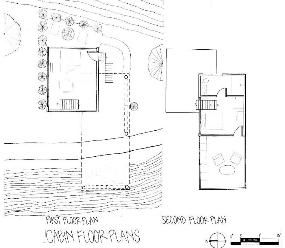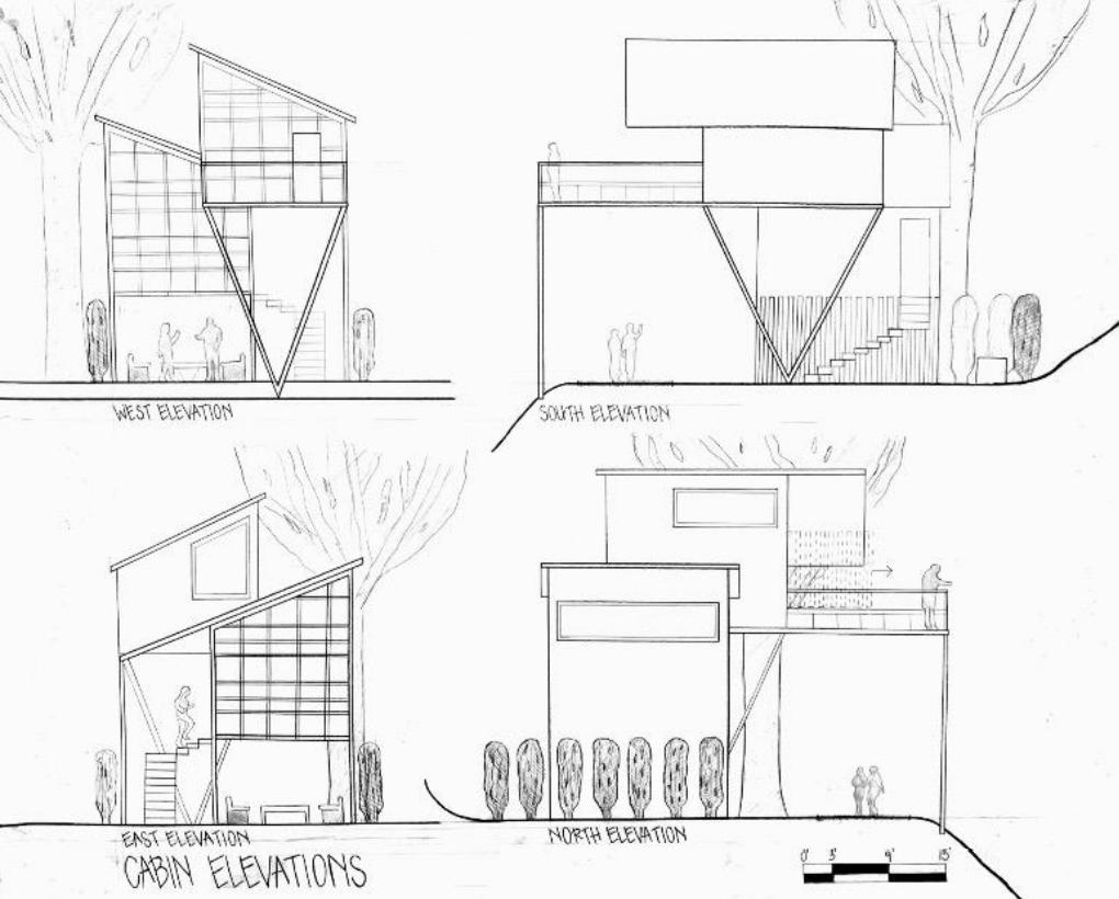 The E+ Cabin was inspired by the case study house, The Tower House, located in Ulster County New York designed by Gluck+. The E+ Cabin was designed to exemplify the design principles of the Tower House — boldness, pattern, reflection, and proportion — in a reimagined way. As a class, the site for a community of cabins next to campus was studied and analyzed so a community path could be decided.