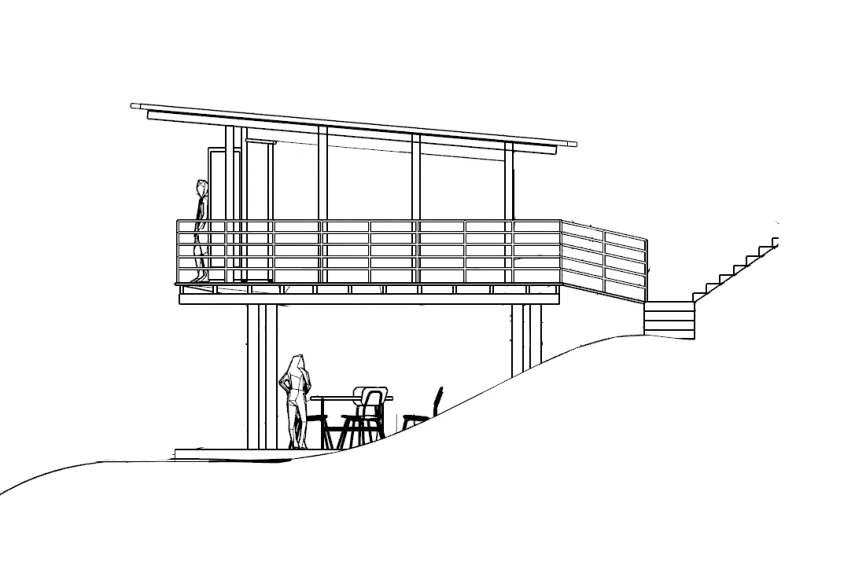 Experiences similar to those of the Tower House were designed. The circulation of both sets of stairs leads one to the tree tops where views are best seen. The Tower House was designed with a small base footprint to leave a low impact on the surrounding environmental, so the e+ cabin was, as well. The cabin’s views are seen from the elevated, private second floor and deck while views can also be seen from the public first floor. The interior stairs thread through the intersection of the two floors creating a nice flow between the spaces. The minimal base footprint creates a covered outdoor area leading to the back yard that path-goers can easily access with permission.