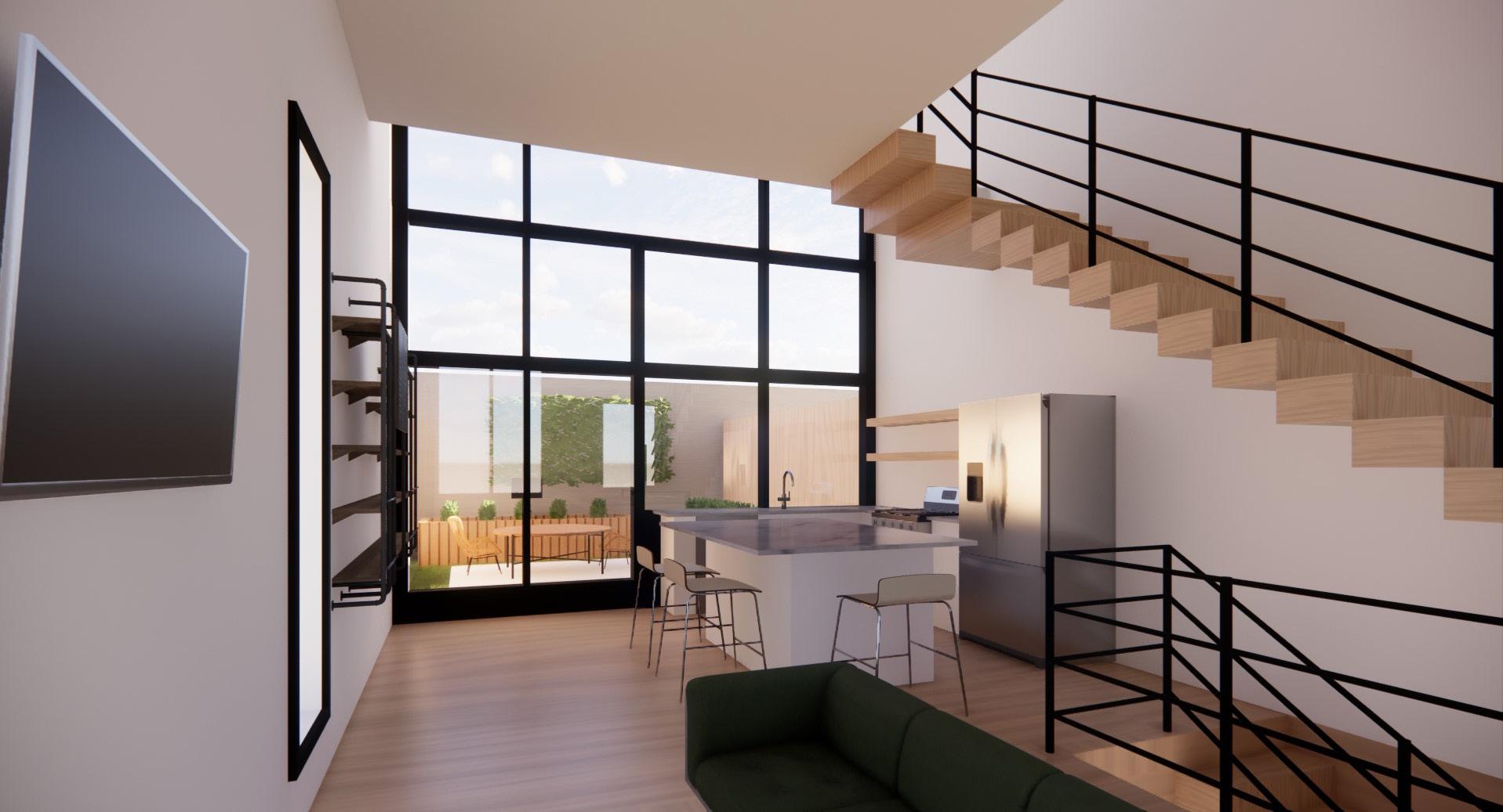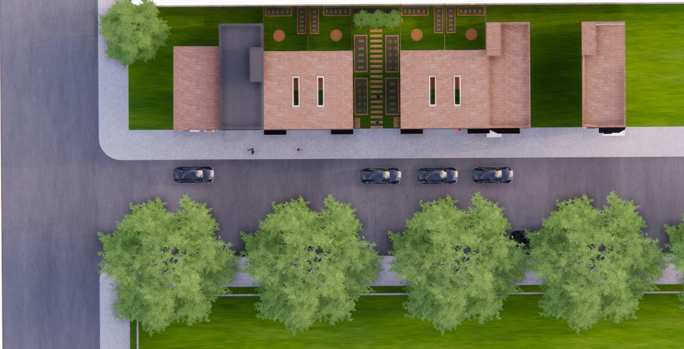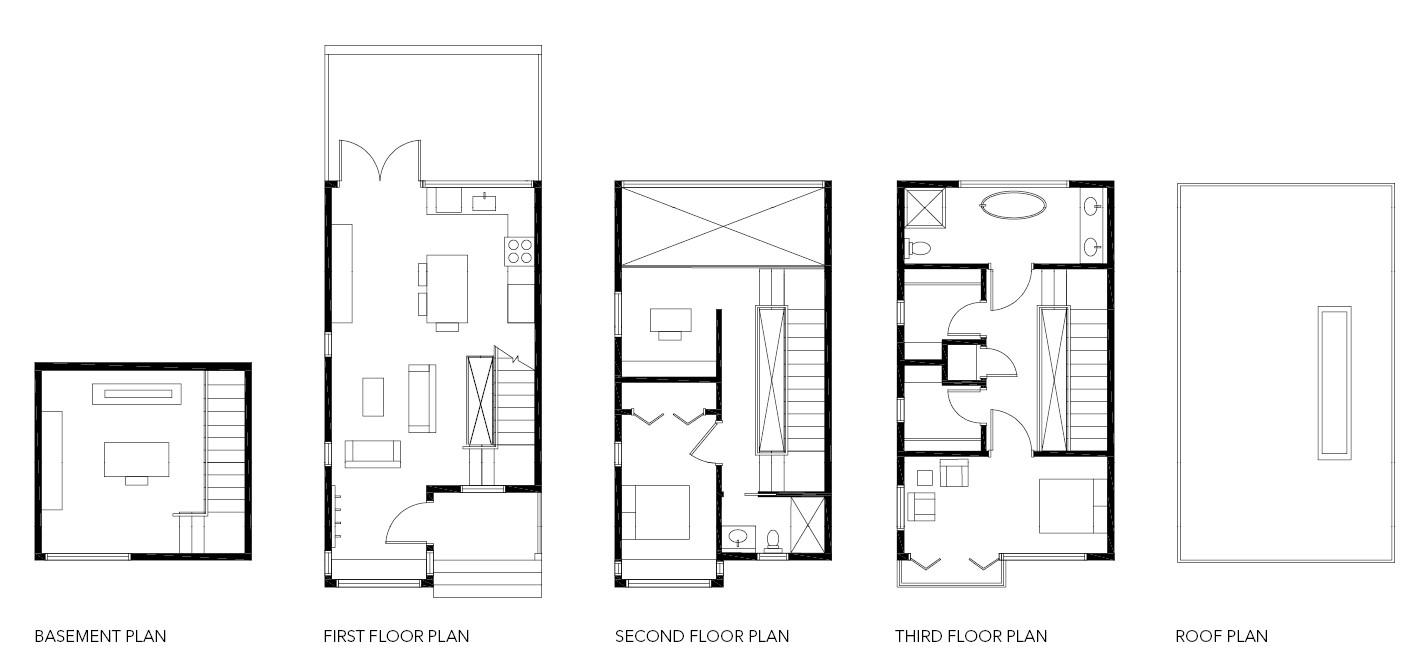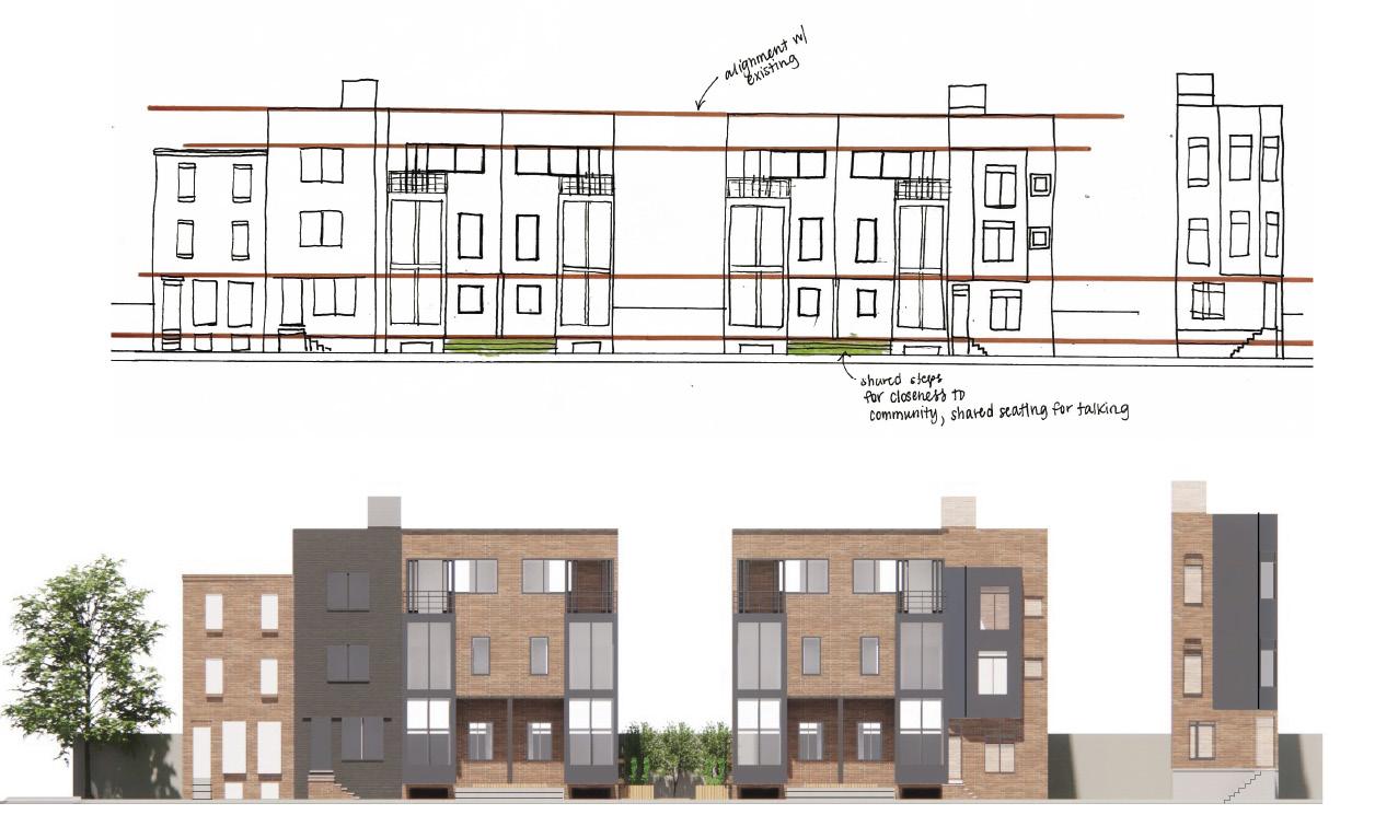 Given five empty plots, the task was to design four similar rowhomes — which respect the existing rowhomes’ designs — and a community space all based on the needs of a client. The client here is an urban gardener who adores spending her time outdoors and sharing her harvests with her neighborhoods. Various elements of the design connect to the clients traits and desires such as a two story bay window on the east facade for lots of light, a two story collection of windows on the west, a shared porch, a sky light from the roof to the basement, and a community garden between two of the rowhomes.