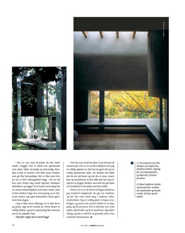 – Det har noe med hvordan vi tar hensyn til naturen på. Det er en norsk tradisjon som jeg er veldig opptatt av. Her har de gjort det på en veldig spennende måte. Du merker det både når du ser på huset og når du er inne, svarer han og innrømmer at han ikke har latt seg in spirere av bygget direkte, men det har gitt ham en forståelse av hvordan man bør jobbe. – Dette var et av de første boligprosjektene jeg studerte inngående da jeg var student, og det har vært med meg i tankene siden studietiden. Jeg er veldig glad i å tegne ene boliger, og synes det nesten alltid er en hyg gelig og fin prosess. Det å utforme noe som andre skal bruke og leve med hver dag føles viktig, og det er derfor et givende yrke å ha, avslutter Rasmussen. N °2 201 7 |