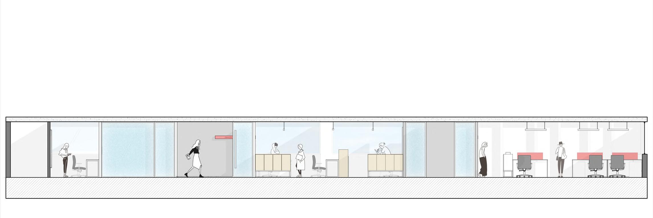 Las oficinas se establecen como un área de trabajo que impulsa al diálogo construvtivo. En su corazón la zona de marketing maneja la mayor libertad espacial. Esta misma, se encapsula entre sala de reuniones y gerencia, para liberar los extremos con la zona de finanzas y recursos humanos, que en sí, son espacios de sensibilidad auditiva.