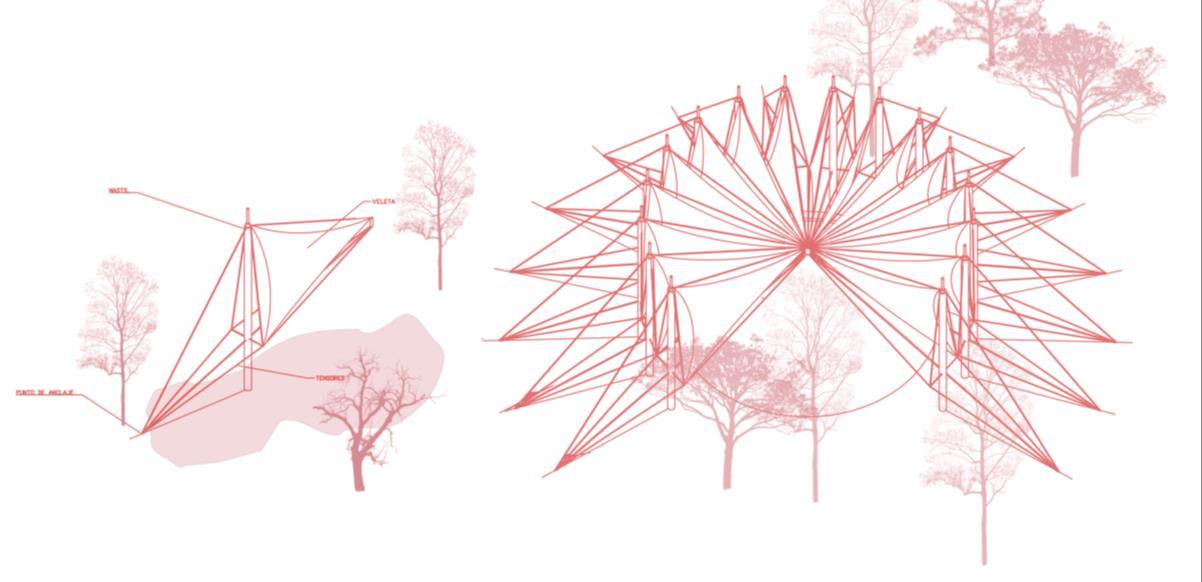 La finalidad del proyecto entre otras era la creación de diferentes atmosferas sucedáneas al recorrido de la intervención, en este caso el andamiaje resuelto de cables y elementos suspendidos genera un recinto cerrado con gradas en el interior para diferentes usos