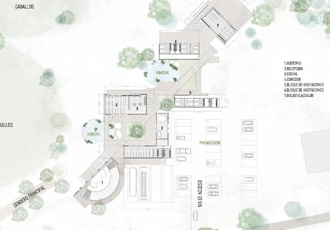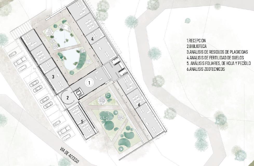 La implantación ubica 3 grandes complejos arquitectónicos correspondientes a un centro de hospedaje para investigadores, laboratorios de investigación y un museo