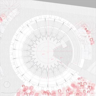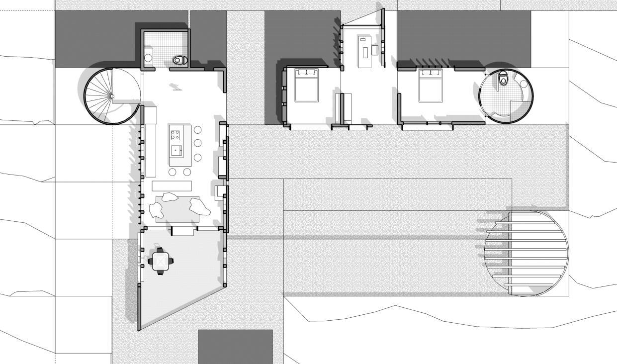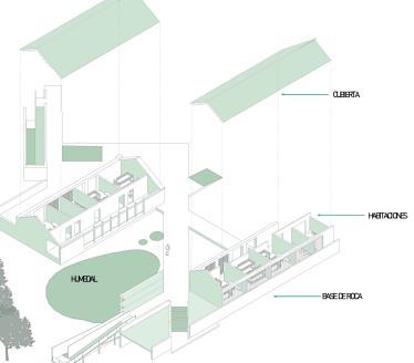 La propuesta es un sistema complementario de trama y urdimbre, un plano rectangular se dobla para generar un pórtico de acceso casi rupestre, el pórtico se enreda con la horadación en el terreno, generando espacios de permanencia