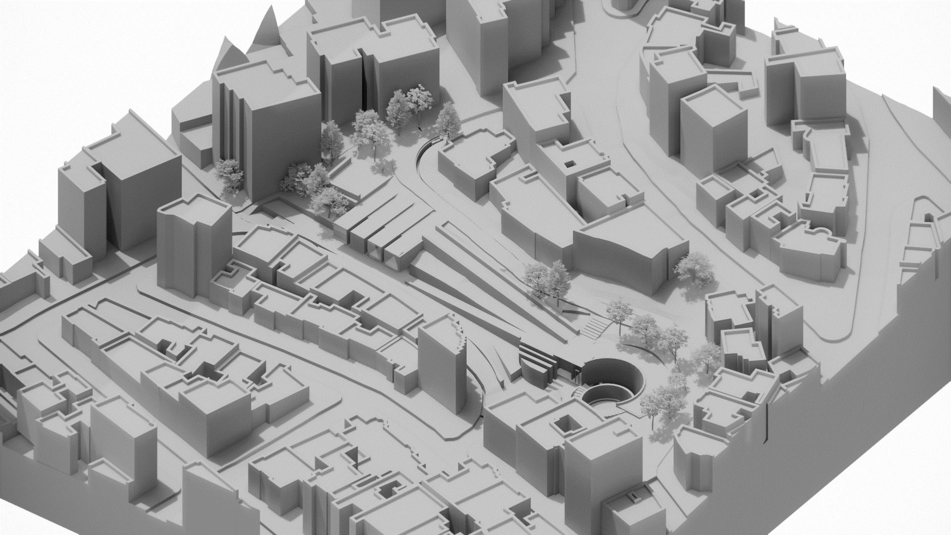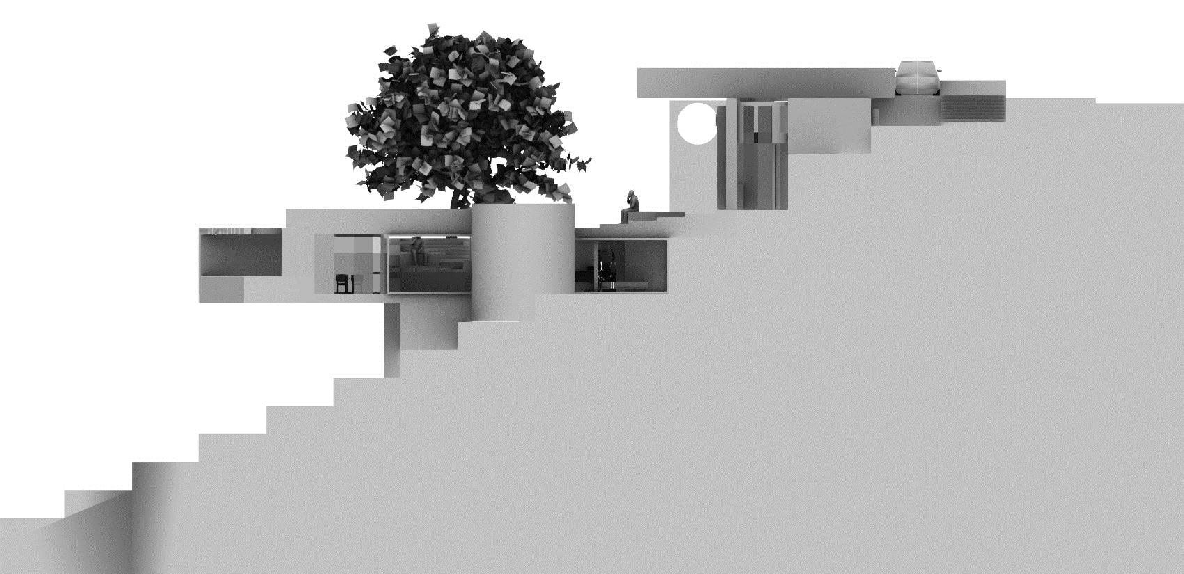 La axonometría revela el terreno en pendiente, la posibilidad en corte y alzado de realizar un espacio público contenido
