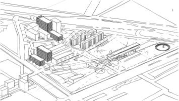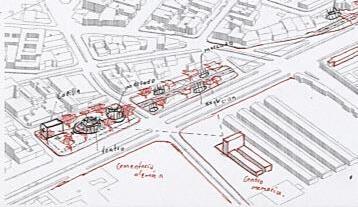 Los bosquejos originales consideraban la articulación de un eje transversal al triangulo para generar espacio público