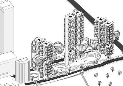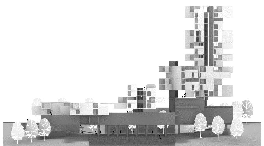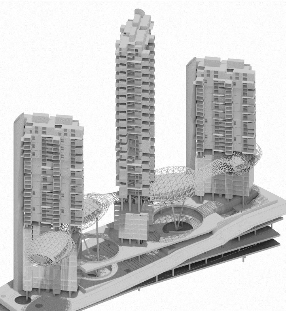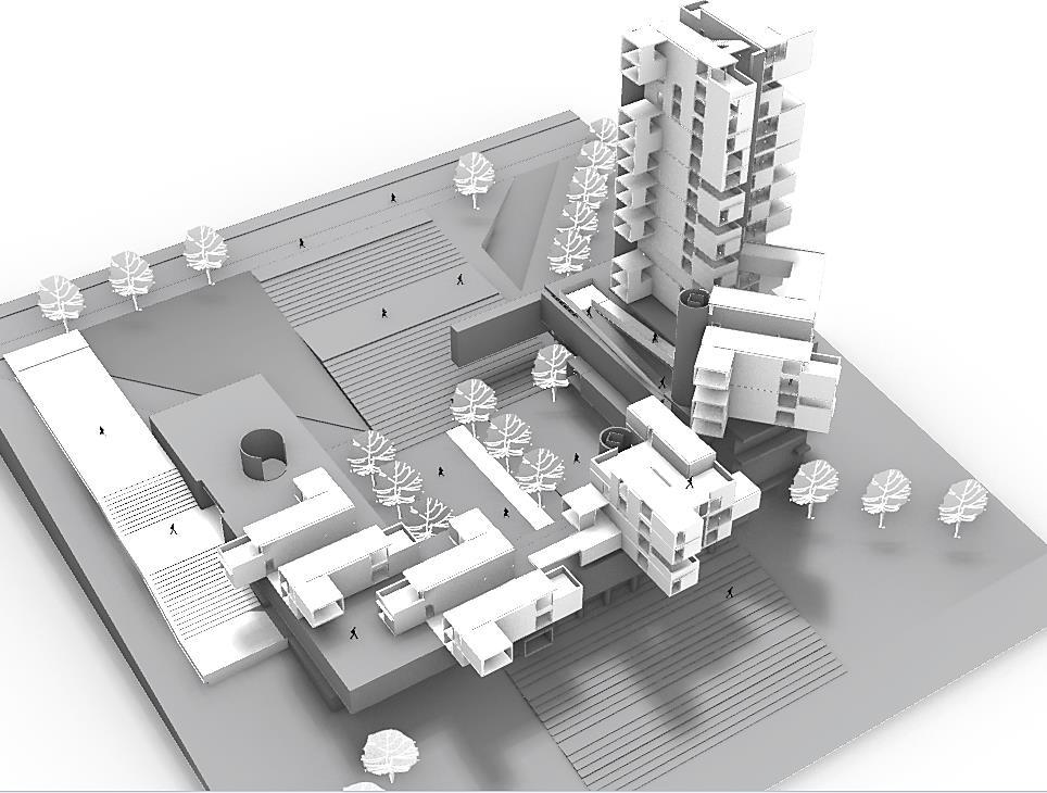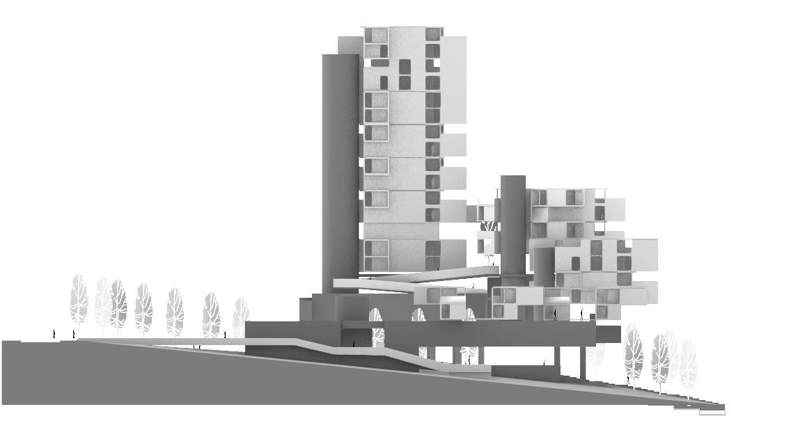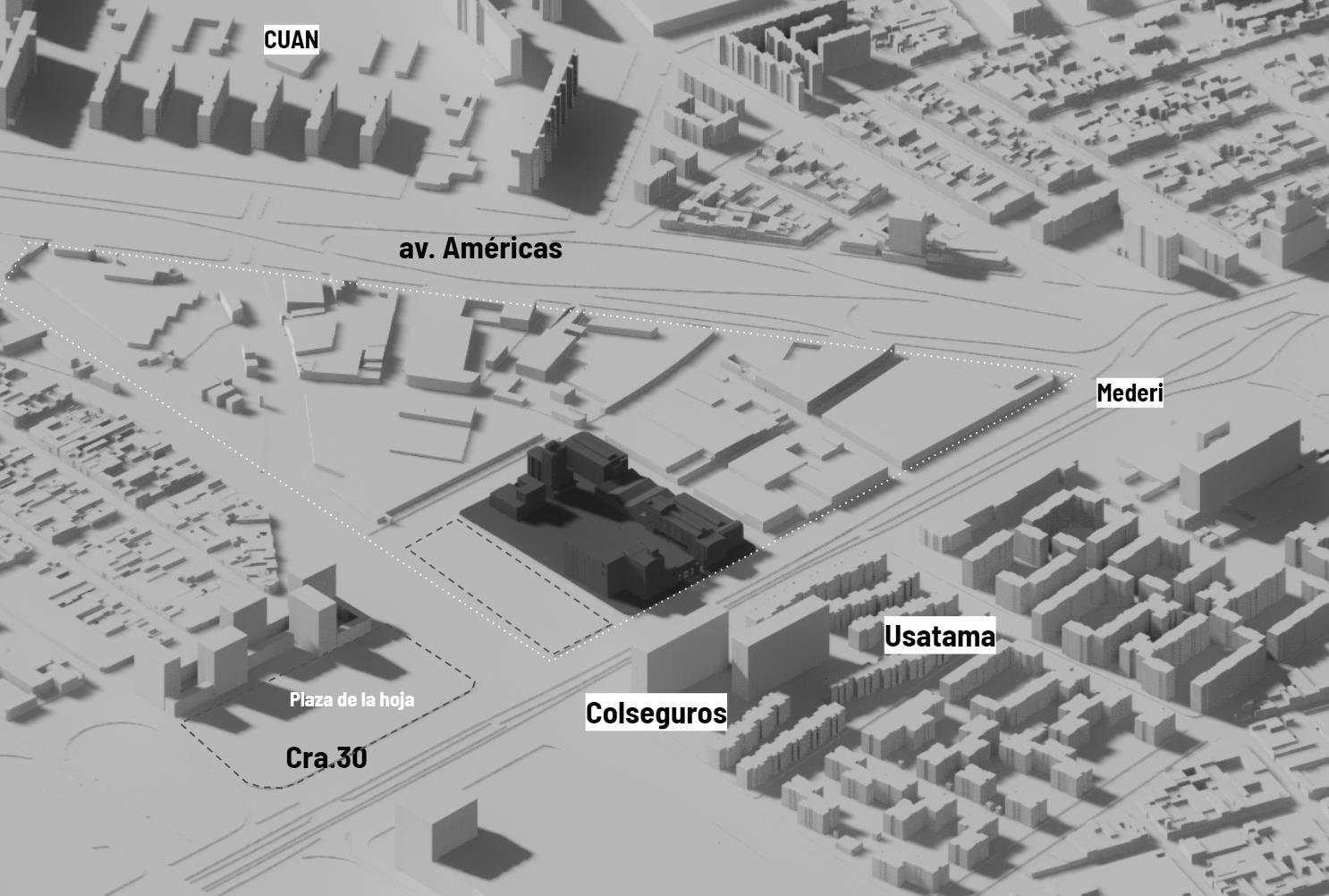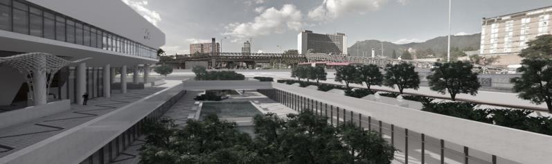 El desarrollo realizado en equipos pretende articular 3 propuestas individuales mediante la utilización de barras y plataformas, esta propuesta destacó por la consolidación de un espacio público permeable pero aislado de la avenida, el manejo de alturas de igual forma garantiza armonía con el contexto urbano circundante