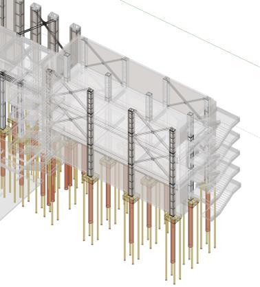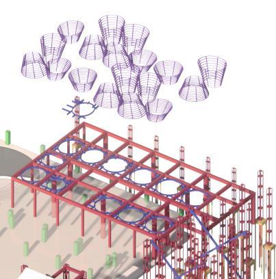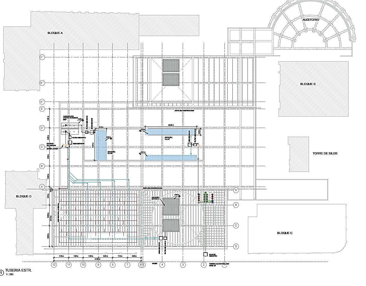 La estructura e instalaciones fueron coordinadas mediante practicas BIM y modelado de ductos y tuberías que constan principalmente de un sistema de recirculación de aguas recogidas mediante AquaCell para sistemas contra incendio y de aguas crudas