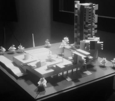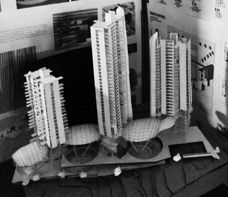 La maqueta evidencia la relación entre los nodos habitacionales y la plazaauditorio, de igual forma las células se levantan sobre pilares para hacer el conjunto enteramente permeable
