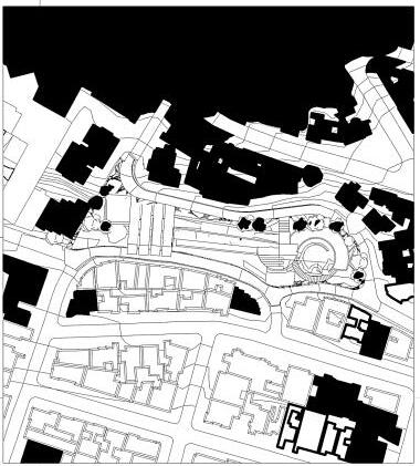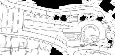 Como se evidencia en el alzado, la topografía permite el desarrollo de escaleras que servirán como mobiliario del espacio público