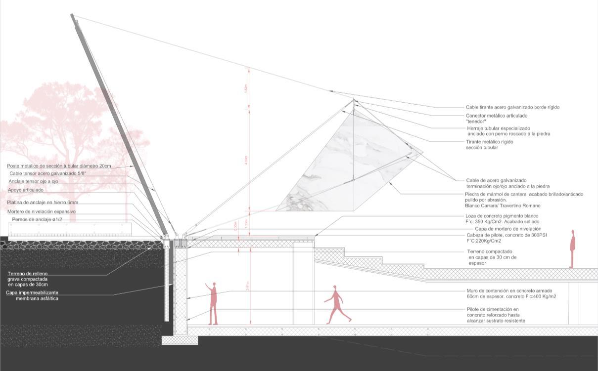 Finalmente, el material elegido para el módulo corresponde a mármol de cantera, este seria izado mediante cables de acero galvanizado, eslingas, postes y estrobos