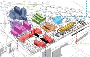 Como resultado se obtienen grandes manzanas de usos mixtos, consolidando una especie de ciudadela aislada de las grandes avenidas Los usos van desde hotelería, oficinas, vivienda, comercio y diferentes clases de edificios administrativos, todo cordialmente articulado por un parque central